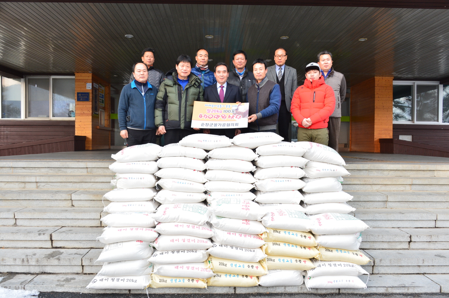 - 순창군 쌀가공협회(회장 최광식)는 21일 어려운 이웃을 위해 써달라며 순창 쌀 100포(20kg 450만원 상당)를 군청에 전달했다. 이날 전달된 쌀은 회원 10여명이 적게는 5포에서 많게는 20포까지 모은 것으로 관내 장애인시설 및 노인요양시설 등에 어려운 이웃들에게 전달할 계획이다. -2016. 01. 21-