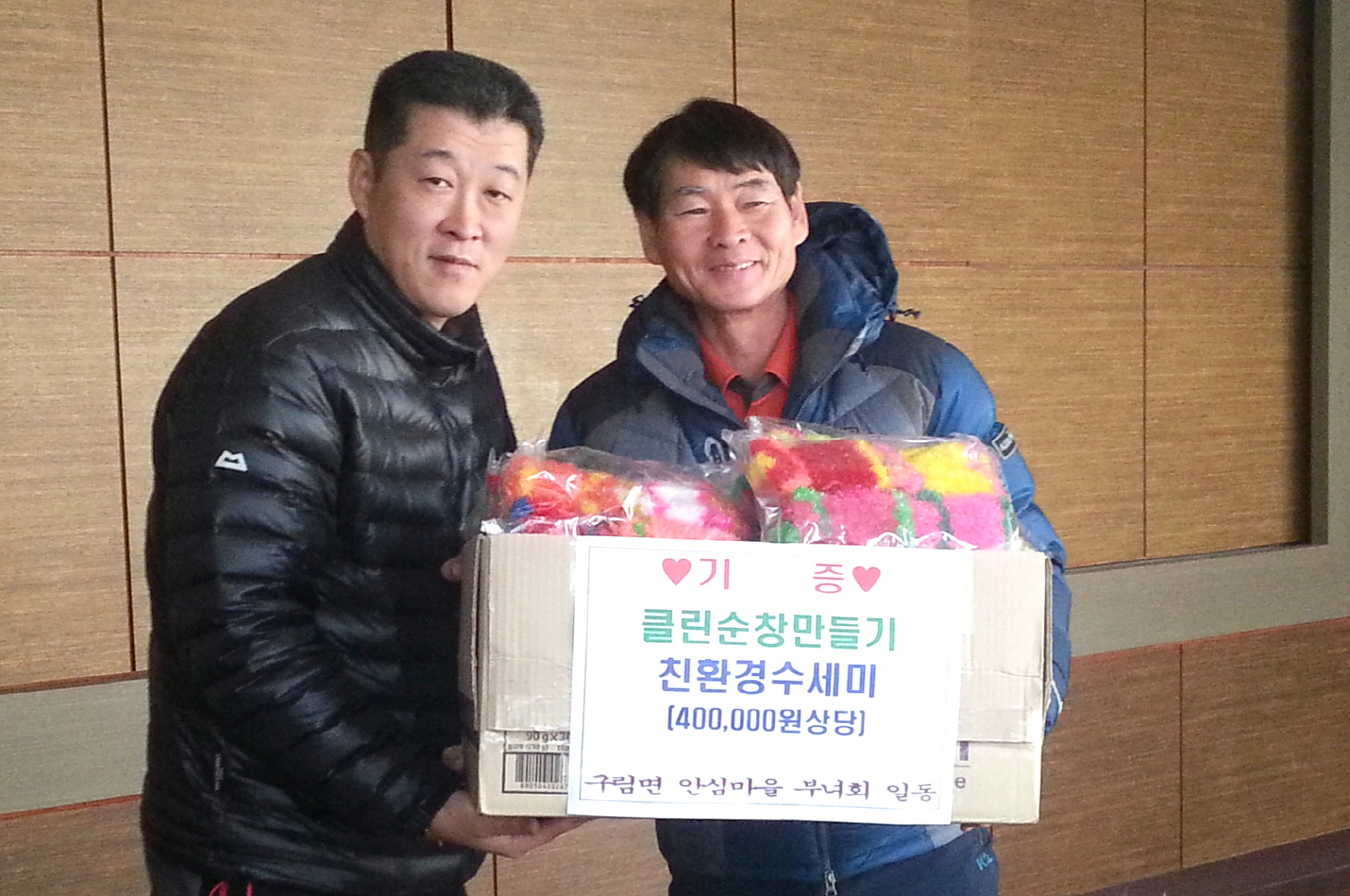 - 구림면 안심마을 부녀회가 최근 직접 제작한 친환경 수제수세미 160개를 이장협의회에 전달해 클린순창 운동에 앞장섰다. 이번에 전달한 수세미는 부녀회원들이 친환경 소재를 사용해 세재를 덜사용하고 거품도 적게 나는 친환경 제품이다. 이장협의회는 관내 30개 마을 경로당이나 단체에 수세미를 전달할 계획이다. -2016. 01. 22-