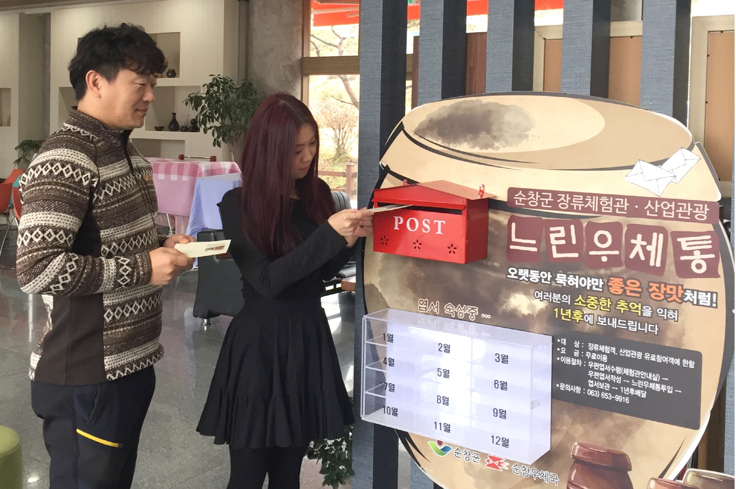 - 순창군장류사업소(소장 한경엽)와 순창우체국(국장 유재윤)은 최근 느린우체통 설치 및 이용에 관한 업무협약을 맺고 장류체험관에 느린우체통이 설치됐다. 이번에 설치한 느리게 가는 우체통은 순창장류체험관을 방문한 관광객들에게 제공하는 엽서에 관광객들에 사연을 적어 우체통에 넣으면 체험관에서 1년 동안 보관했다가 각 수취인에게 무료로 배달해 주는 특별한 이벤트다. -2015. 12. 28-