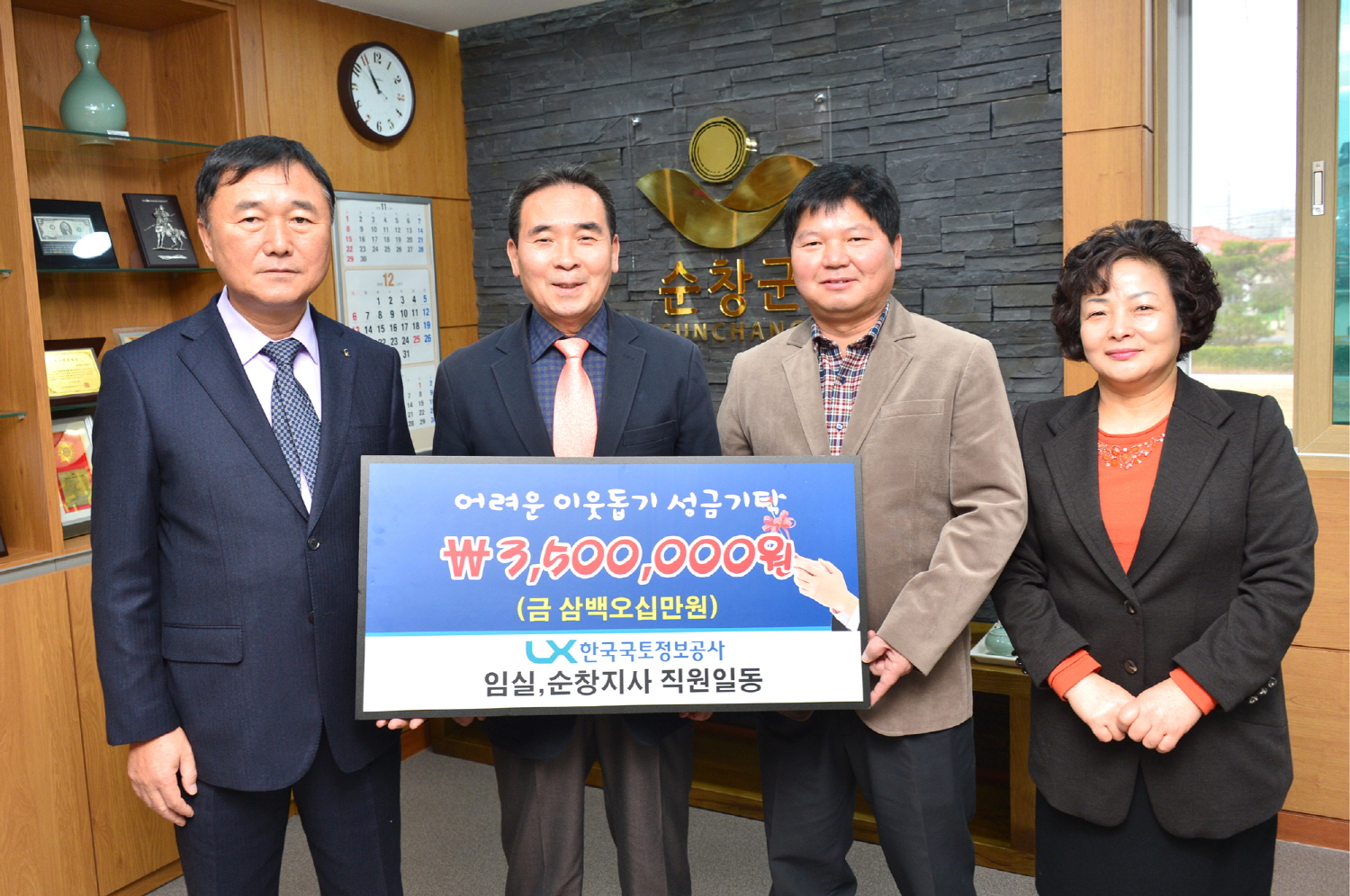 - 한국국토정보공사 임실순창지사(지사장 장수환)는 15일 순창군청을 찾아 어려운 이웃을 위해 써달라며 전 직원들이 참여해 모은 돈 350만원을 기탁했다. -2015. 12. 15-