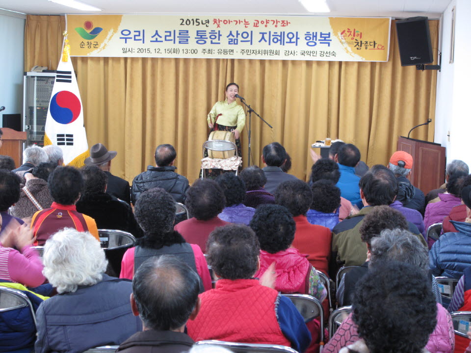 - 15일 유등면사무소 2층 회의실에서 유등면민 100여명이 참여한 가운데 국악인 강선숙 명창을 초청, ‘우리 소리를 통한 삶의 지혜와 행복’이라는 주제로 교양강좌를 실시했다. -2015. 12. 16-