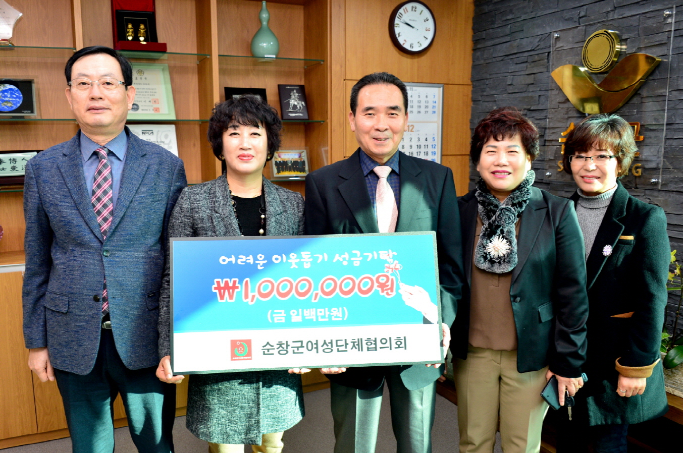 - 순창군여성단체협의회(회장 김인자)는 16일 순창군청을 찾아 어려운 이웃을 위해 써달라며 성금 백만원을 황숙주 군수에게 기탁했다. -2015. 12. 16-