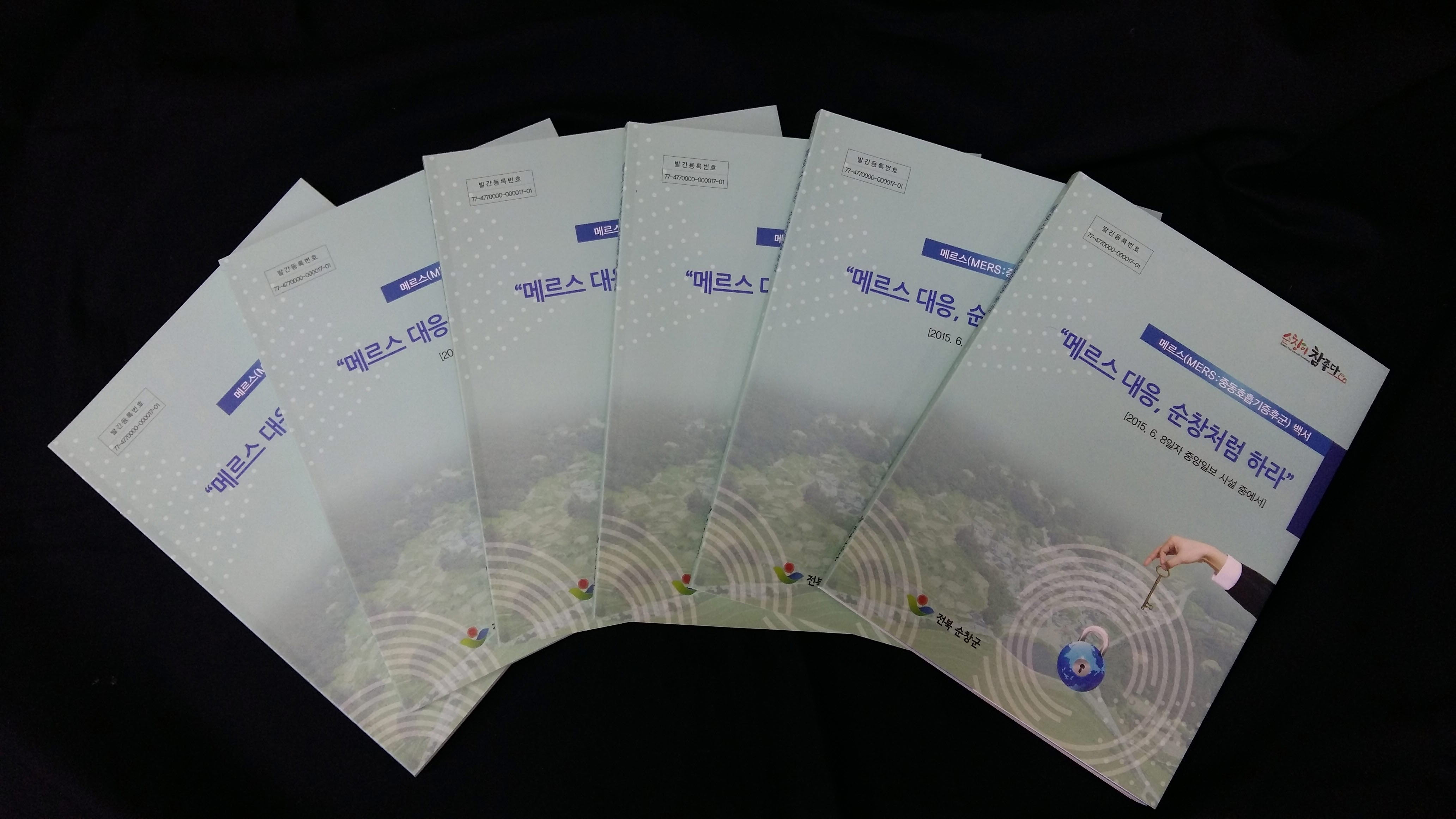 - 순창군은 지난 6월 14일간의 메르스(MERS:중동호흡기증후군) 발생부터 극복까지 경험 진솔하게 담은 메르스 극복이야기를 책자로 발간했다. 이번에 발간한 백서는 발생단계인 6월 4일부터 해제일인 6월 18일까지 긴박했던 상황이 당시 현장에서 근무했던 공무원들의 경험을 바탕으로 진솔하게 담겨져 있다. -2015. 12. 17-