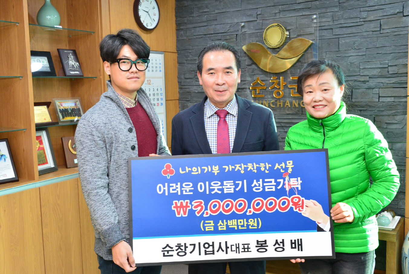 - 순창기업사 봉성배 대표가 8일 순창군청을 찾아 어려운 이웃을 위해 써달라며 황숙주 군수에게 300만원을 기탁했다. -2015. 12. 8-