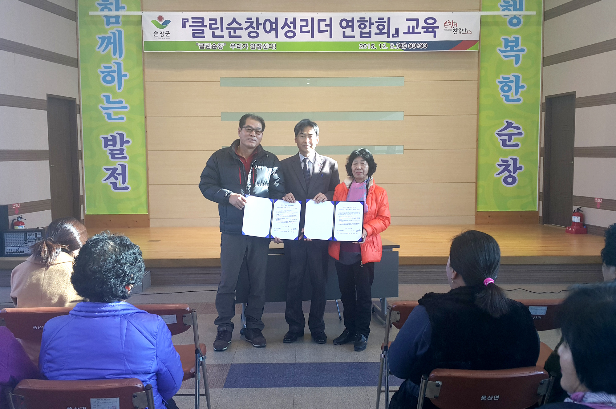 - 풍산면 클린순창 여성리더 연합회와 (유)순창수지(대표 임춘원)는 8일 풍산면사무소 회의실에서 임재호 풍산면장, 임춘원 (유)순창수지 대표, 풍산면 클린순창여성리더 회원 등 70여명이 참석한 가운데 클린순창 만들기에 상호 협력하기로 하는 업무협약을 체결했다. 이날 협약에 따라 (유)순창수지는 풍산면 클린순창 여성리더 연합회가 수집한 각종 폐자원에 대해 매입한 금액의 20%에 해당하는 금액을 장려금으로 추가 지급하기로 했다. -2015. 12. 9-