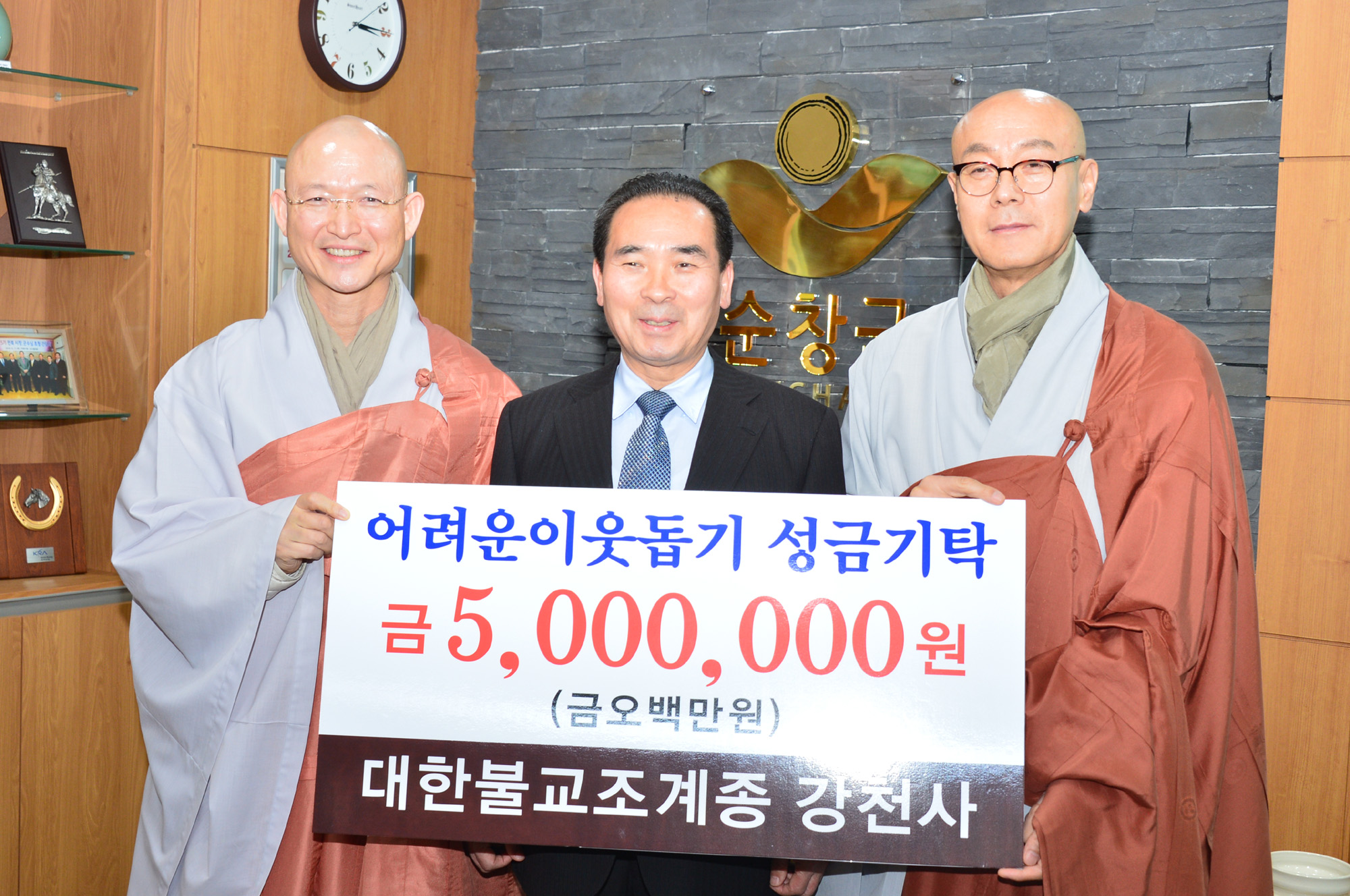 - 강천사 주지 종고스님이 27일 순창군청을 찾아 저소득 학생과 독거노인 등 어려운 이웃들에게 써달라며 현금 3백만원과 라면 100box 등 오백만원 상당을 황숙주 군수에게 전달했다. -2015. 11. 27-