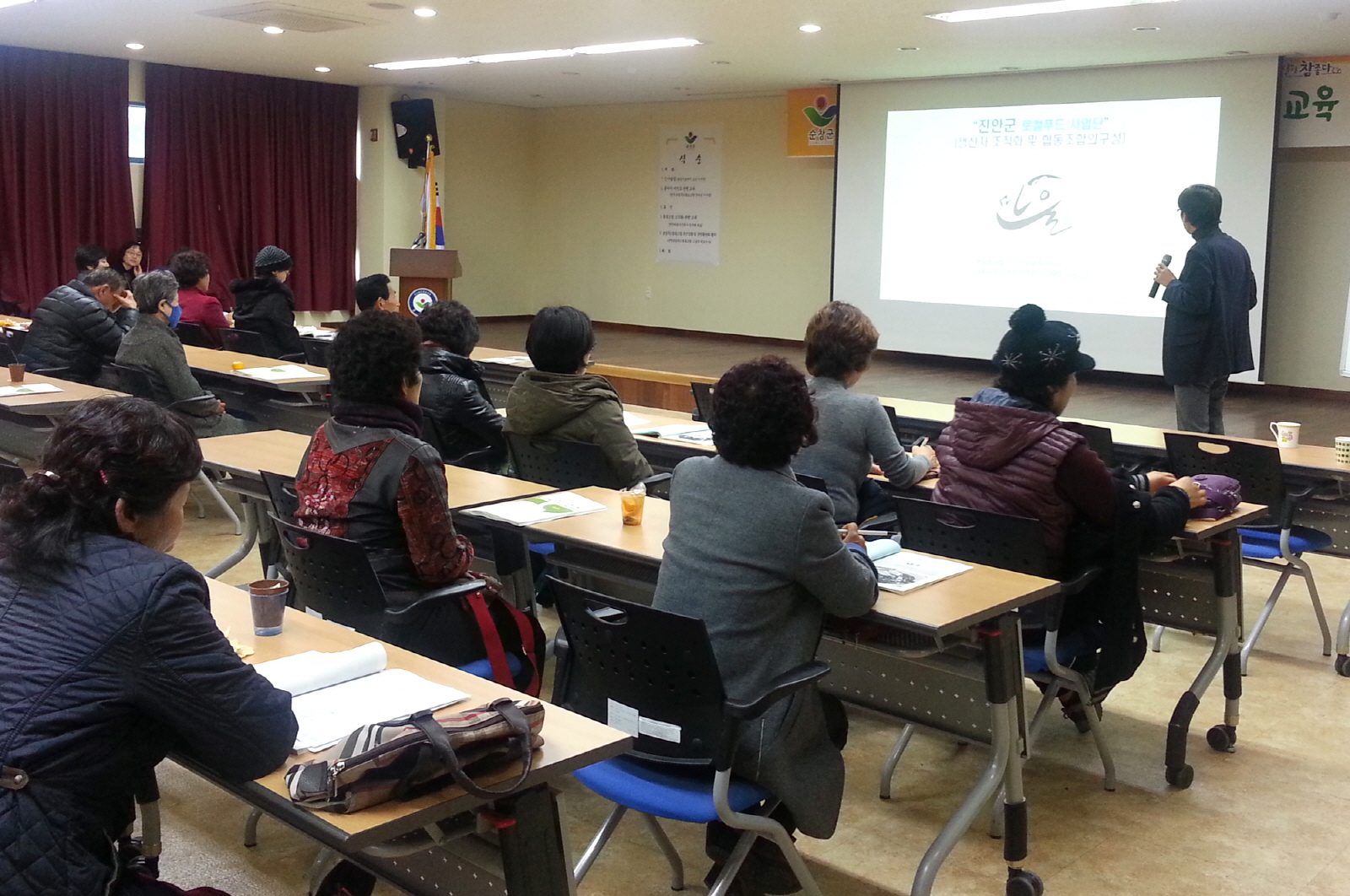 - 30일 농업기술센터 강당에서 농특산물 직판장 출하농가 100여명을 대상으로 ‘농특산물 출하자 마인드 향상을 위한 특별 교육’을 실시했다. 이날 교육은 군이 민간 주도로 농특산물 직판장을 운영할 계획인 가운데 농업회사법인 진안마을 주식회사 강주현 대표의 협동조합 조직화 관련 교육도 진행돼 참여자들의 관심을 집중 시켰다. -2015. 11. 30-