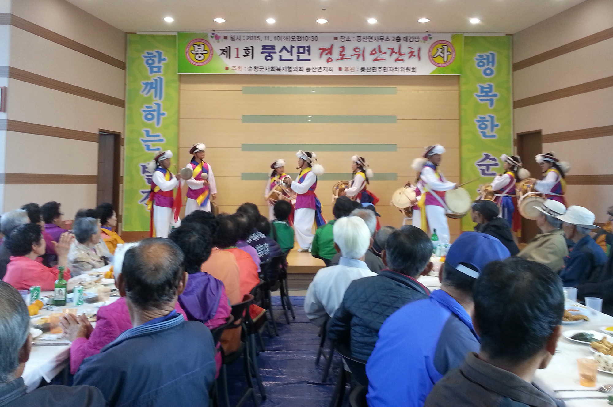 - 제1회 풍산면 경로위안잔치가 10일 풍산면사무소 대강당에서 200여명의 지역 어르신이 참여한 가운데 성대하게 진행됐다. 이번 위안잔치는 순창군 사회복지협의회 풍산면 지회(지회장 정옥식)가 주최한 행사로 풍산지역 어르신들의 건강을 기원하고 어르신들에게 즐거운 시간을 마련해 주기 위해 마련됐다. -2015. 11. 10-