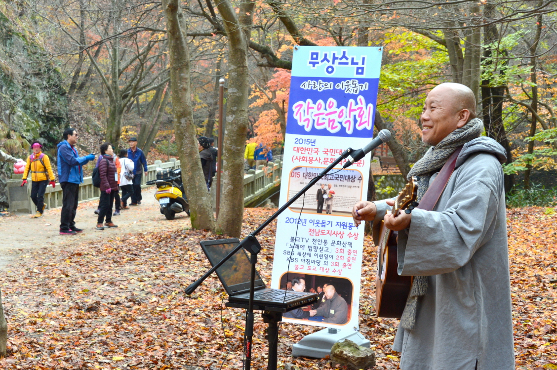 - 전국을 순회하며 거리공연을 하고 있는 무상스님이 순창 강천산 군립공원 현수교 아래에서 기타로 노래하며 깊어가는 강천산 가을하늘을 음악향기로 물들이고 있다. 무상스님은 11월 말까지 노래를 계속한다며 익숙한 올드팝송과 가요를 부르며 아름다운 강천산을 찾은 등산객들의 발길을 붙잡으며 사람들 가슴에 감동을 주고 있다. -2015. 11. 11-