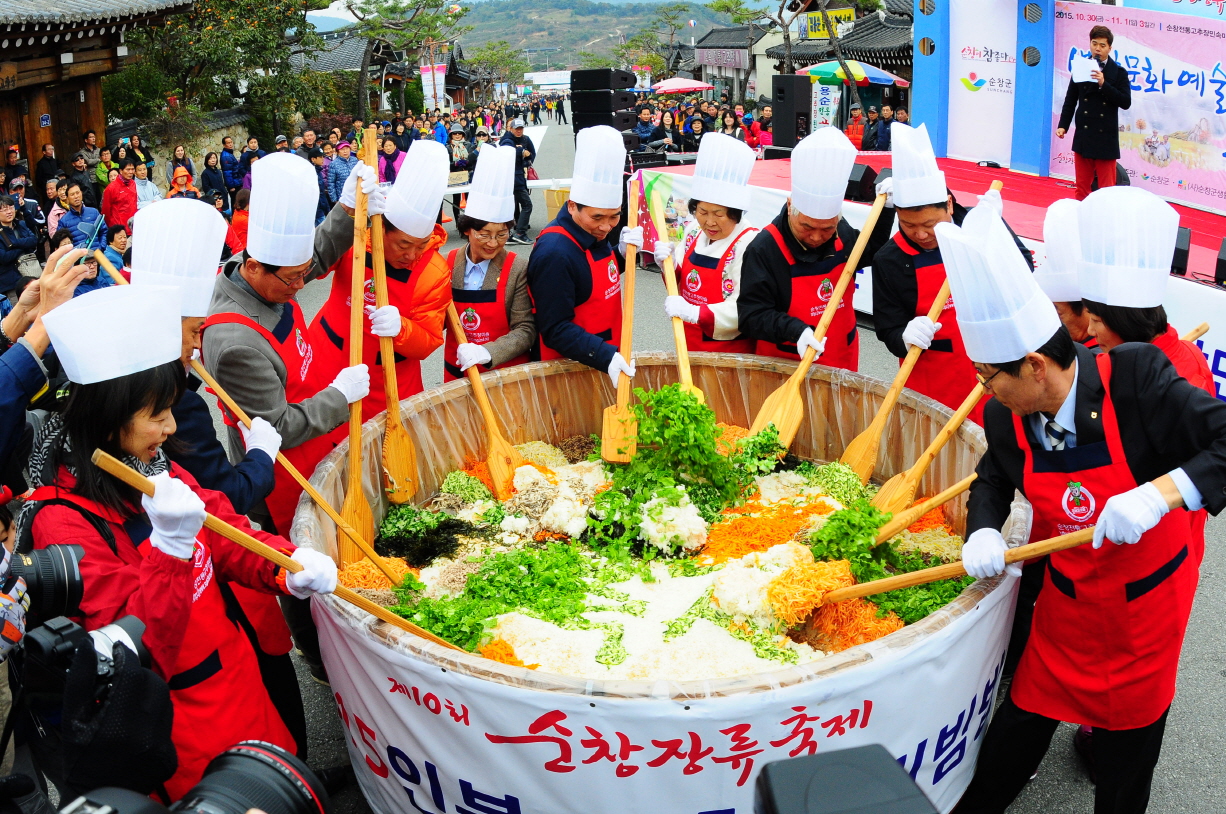 - 자연의 맛 그대로 순창의 맛 세계로 라는 주제로 열리고 있는 제10회 순창장류축제 마지막 날인 1일 순창전통고추장 민속마을 특설무대에서 순창고추장 기능인들이 준비한 2015인분 초대형 비빔밥만들기 행사가 열렸다. 순창고추장 기능인들과 황숙주 순창군수, 이기자 군의회의장을 비롯 이남 순창장류축제추진위원장들이 참여한 가운데 유기농 무농약 쌀에 순창전통고추장과 각종나물을 넣고 참기름 두병을 넣어 더욱 고소하게 비벼 축제장을 찾은 관광객들과 함께 나눴다. -2015. 11. 1-