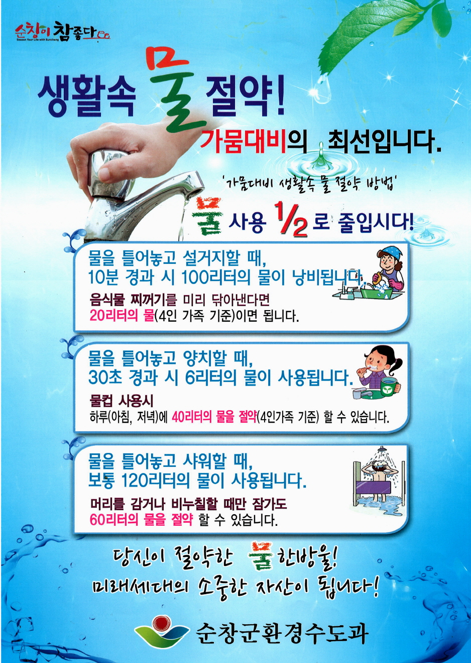 - 최근 극심한 가뭄으로 물 부족 현상이 심화되는 가운데 물 절약을 생활화 하는 물절약 리플릿 1만 4천부 제작 배포하며 '물 절약 실천 방법' 홍보에 적극 나섰다. 군에서는 하루 공급되는 생활용수는 지방상수도 6,500㎡, 광역상수도 2,200㎡이 공급되고 있으며, 비상급수시설 7개소가 상수도에 연결되어 긴급 상황이 발생하면 가동할 수 있도록 되어 있다. 순창은 올 10월 현재 강수량이 765mm로 지난해 1,293mm의 60%에 불과한 실정이다. -2015. 11. 2-