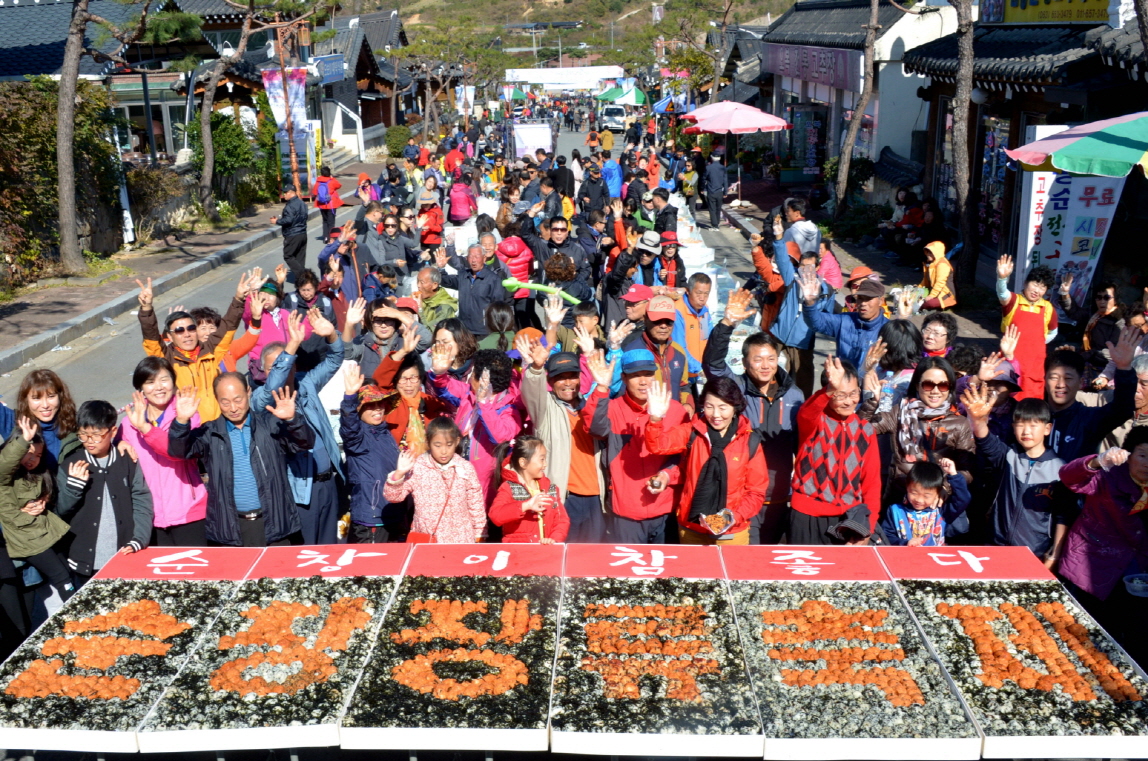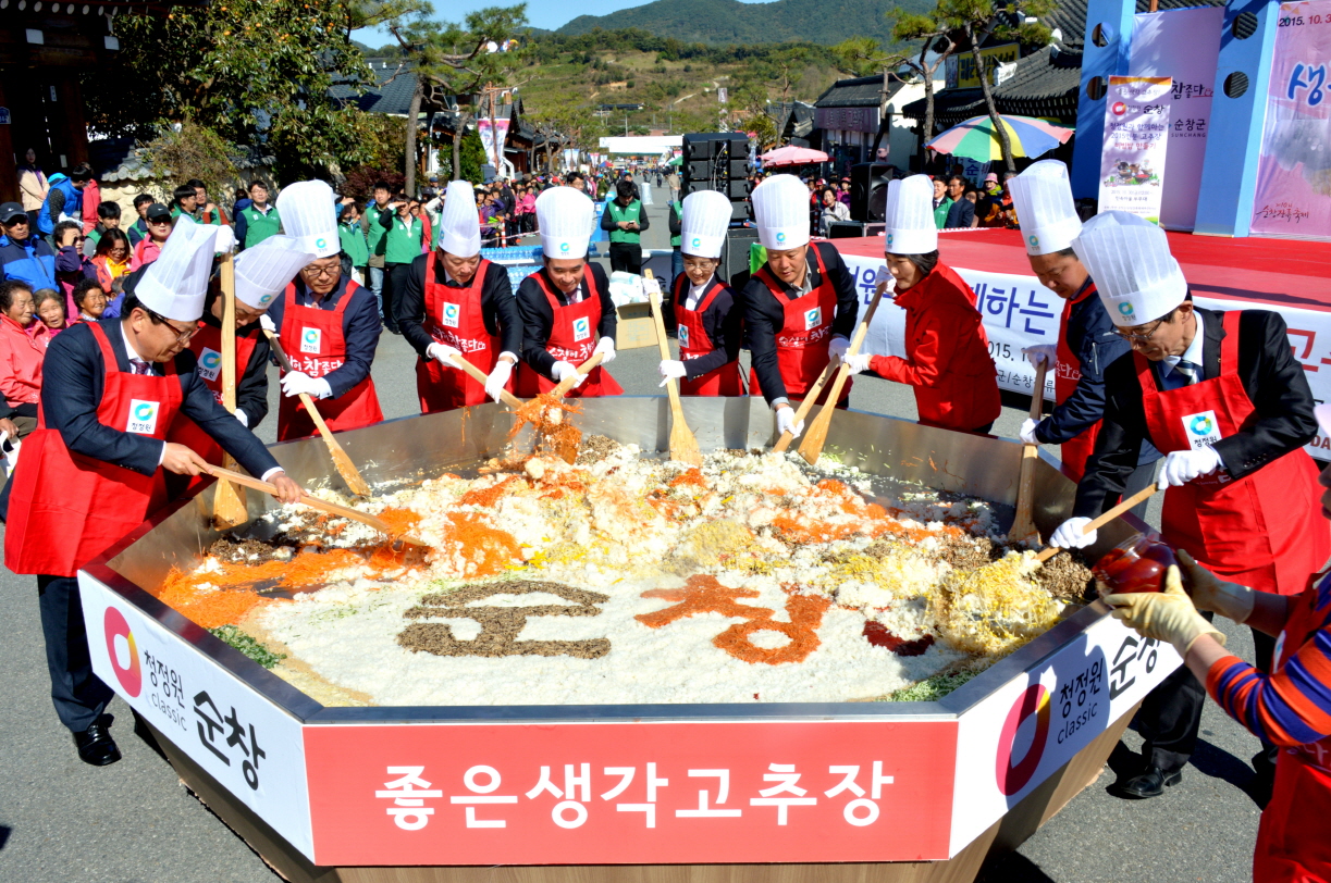 - 30일 순창장류축제가 한창인 순창전통고추장 민속마을 특설무대에서 황숙주 순창군수, 이기자 군의회의장을 비롯 이남 순창장류축제추진위원장, 마을주민 관광객 등이 참석한 가운데 청정원 순창쌀고추장으로 만든 2015인분 비빔밥을 만들어 축제장을 찾은 관광객들과 함께 나눴다. 이날 순창전통고추장민속마을 주민들이 순창고추장의 우수성을 널리 알리고자 정성을 모아 만든 비빔밥은 대형 가마솥에 사골국물로 만든 밥에 버섯, 마늘, 무생채, 애호박, 도라지, 상추, 콩나물, 참기름 등 순창산 각종나물과 양념을 넣고 정성을 모아 청저원 순창쌀고추장과 함께 고루 비볐다. -2015. 10. 30-