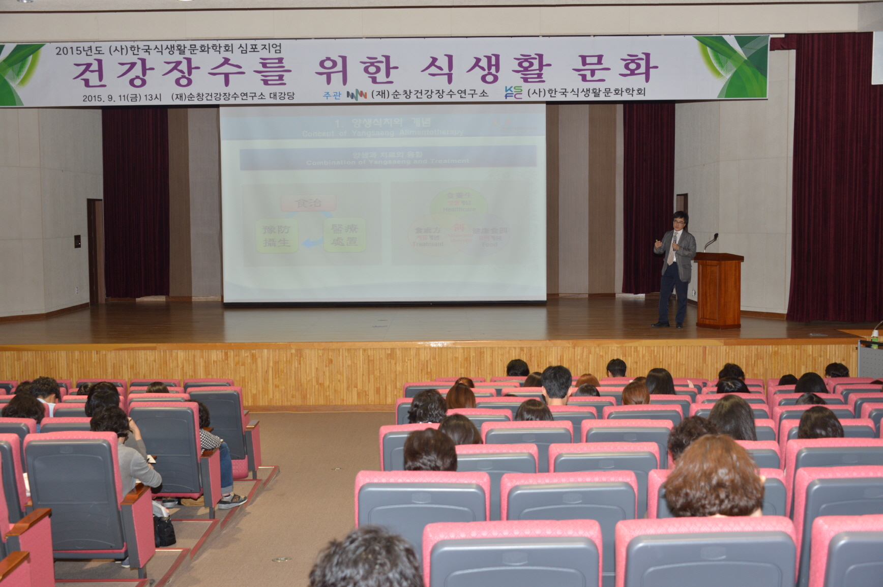 - 11일 건강장수를 위한 식생활 문화에 대해 연구 성과를 공유하고 앞으로 연구 방향을 논의하기 위한 심포지엄이 관련 전문가 200여명이 참석한 가운데 순창건강장수연구소에서 열렸다. 이날 심포지엄에는 이영은 한국식생활문화학회장, 한국한의학연구원 안상우 박사, 경희대학교 식품영양학과 오세영 교수, 서울대학교병원 핵의학과 강건욱 교수 등 건강장수관련 전문가가 대거 참석해 눈길을 끌었다. -2015. 9. 11-