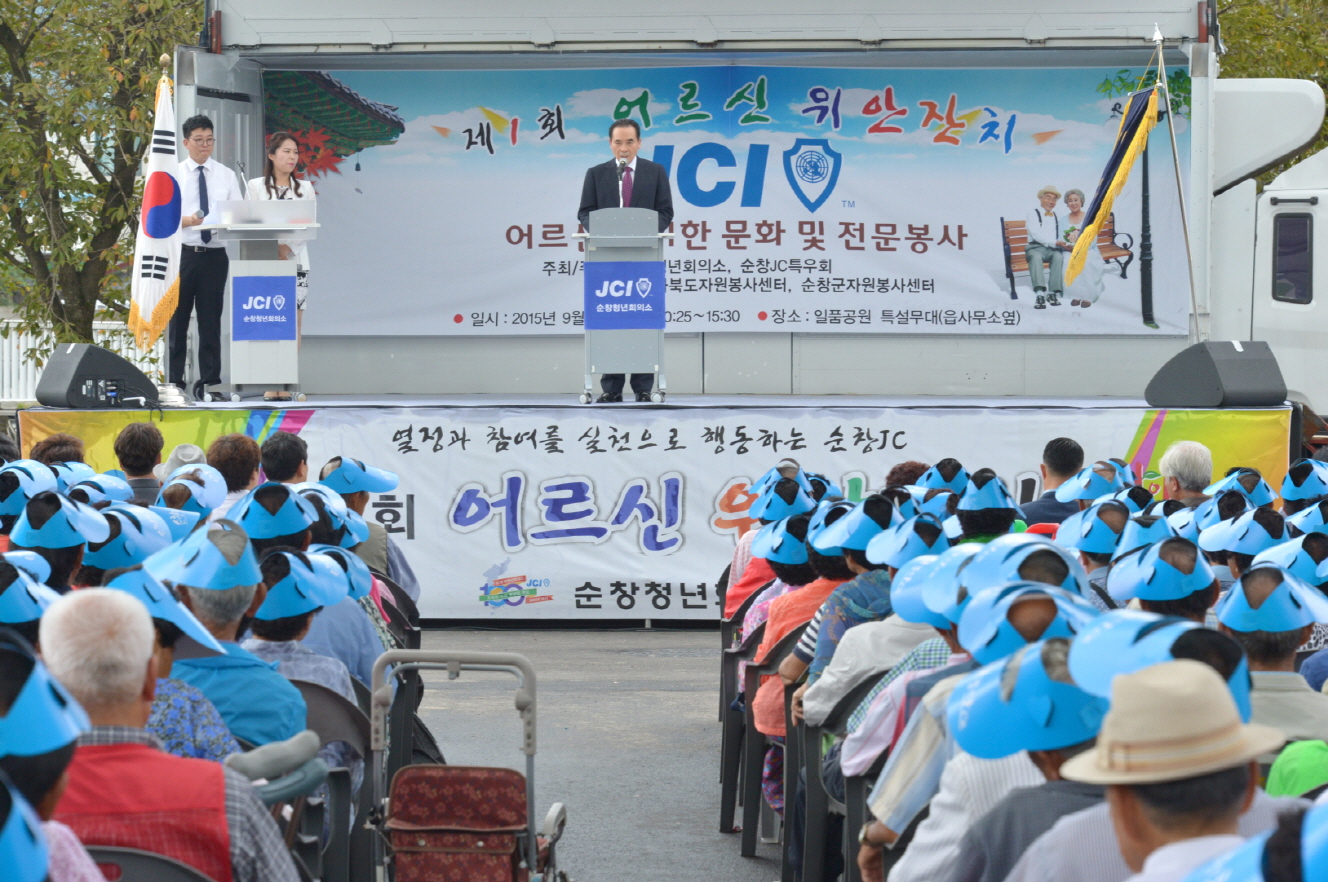 - 제1회 순창군 어르신 위안잔치가 6일 일품공원에서 어르신 1,000여명 참석한 가운데 이미용 봉사, 가요쇼 등 문화행사가 풍성하게 열렸다. 이날 어르신 위안잔치는 (사)전라북도자원봉사센터(이사장 김기원)에서 주최했고 순창청년회의소(회장 장승필)와 순창군자원봉사센터(소장 임금순)가 주관하였다. 청년회의소에서는 행사장 준비와 문화공연, 다과준비로 돼지 4마리분 수육, 과일, 떡, 김치, 술안주, 음료 등을 준비했고, 하이트맥주와 남원 선원사에서는 생맥주와 자장면 500그릇을 각각 지원해 나눔의 즐거움을 더했다. -2015. 9. 7-