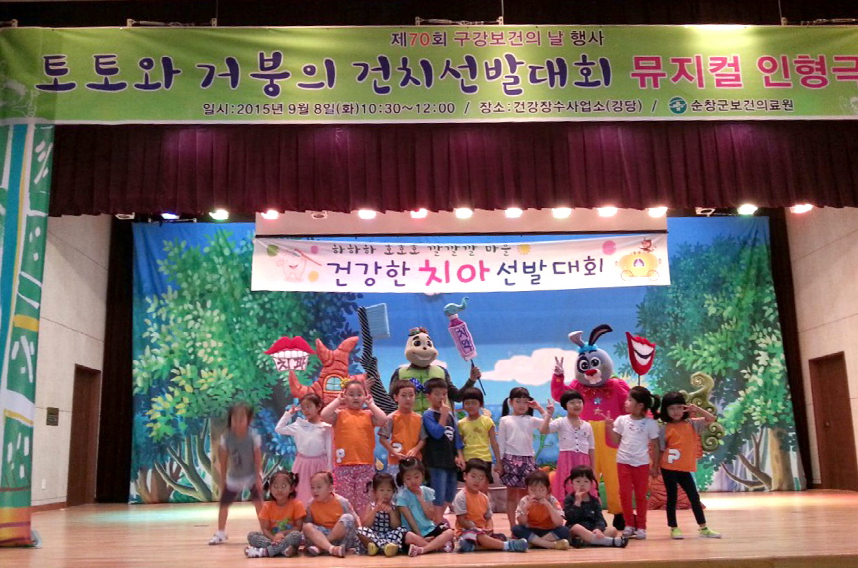 - 8일 구강보건 향상을 위해 ‘토토와 거붕의 건치아동 선발대회’라는 뮤지컬 인형극을 진행해 어린이들의 구강보건 의식에 큰 도움을 줬다. 이번 어린이 뮤지컬은 관내 어린이집과 초등학교 병설유치원 6 ~ 7세 어린이 300여명을 대상으로 건강장수연구소 대강당에서 진행됐다. -2015. 9. 8-