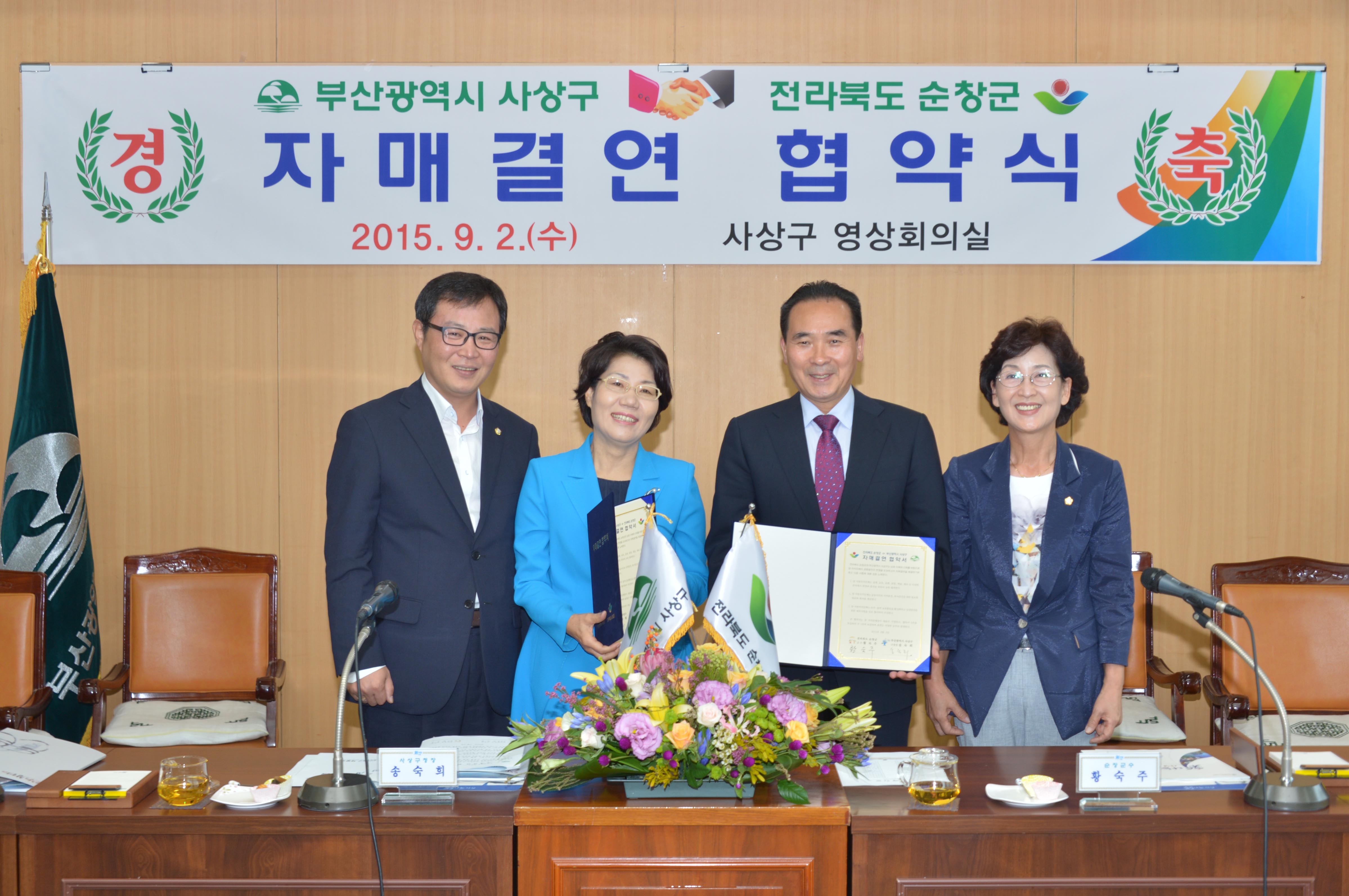 - 순창군(군수 황숙주)과 부산사상구(구청장 송숙희)는 2일 부산광역시 사상구청 영상회의실에서 양측 단체장, 의장, 사회단체장 등 40여명이 참석한 가운데 행정·문화·관광·체육·농업 등 다양한 분야의 상호발전을 위한 자매결연 협약을 체결했다. 이날 협약을 계기로 두 자치단체는 영호남 화합은 물론 양자치단체의 상호 이익을 위해 교류하게 된다. 특히 청정 자연이 보존된 순창군과 산업·물류·유통 중심지인 사상구와는 상호 부족한 부분을 보완하고 교류를 통한 이익창출에 큰 도움이 될 수 있을 것으로 기대하고 있다. -2015. 9. 2-