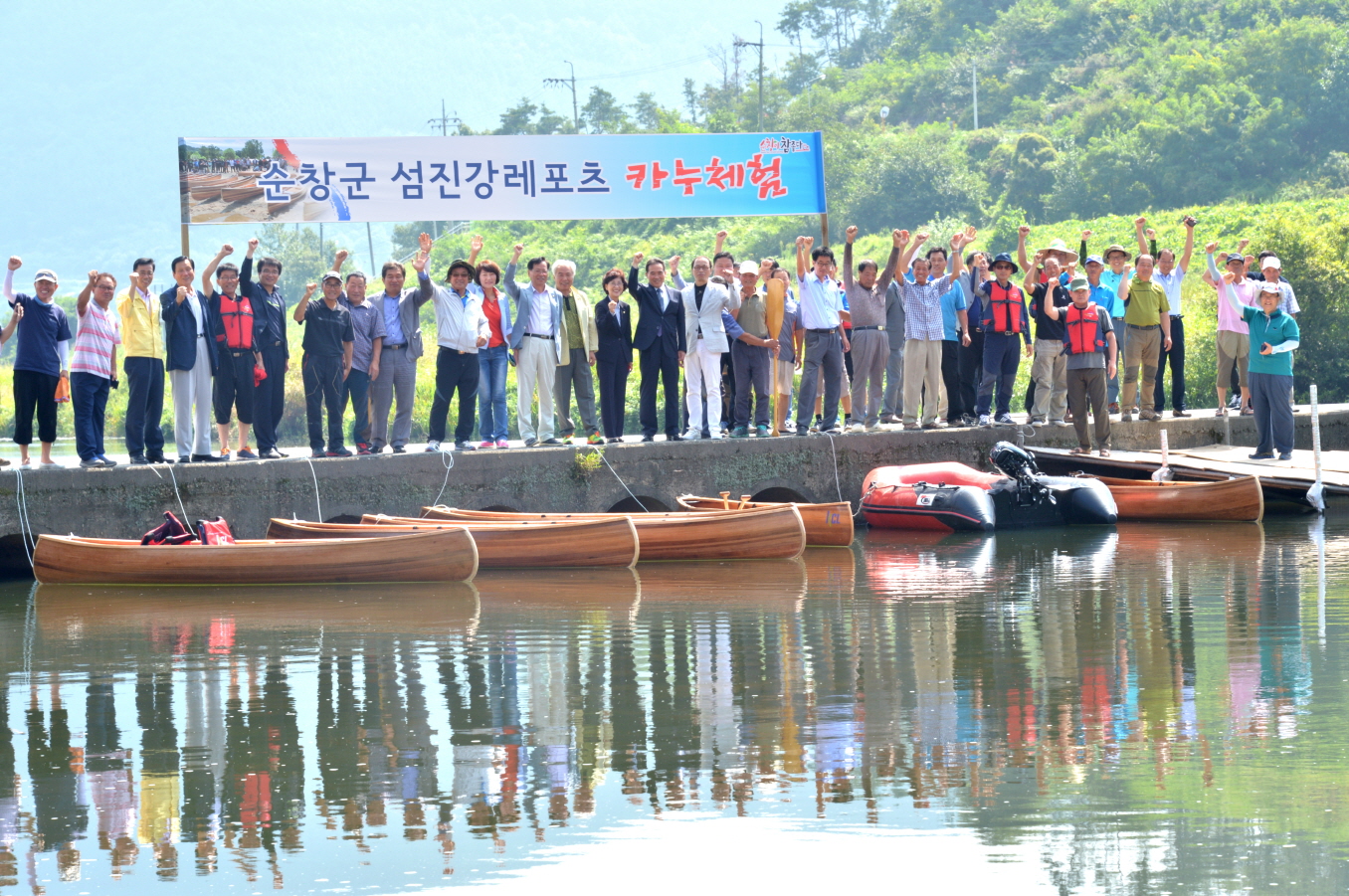 - 섬진강 레저산업육성추진위원회(위원장 최윤화)는 4일 적성면 알곡매운탕 앞 섬진강변에서 황숙주 군수, 이기자 군의장, 주민 등 100여명이 참석한 가운데 주민들이 직접 제작한 15대의 목재카누 진수식을 가졌다. 이날 진수한 목재카누는 섬진강 레저산업과 연계한 주민소득창출을 위해 한국건설생활환경시험연구원의 기술지도로 30명의 주민들이 2인 1조가 되어 지난달에 10일 동안 15대의 카누를 제작하였다. -2015. 9. 4-