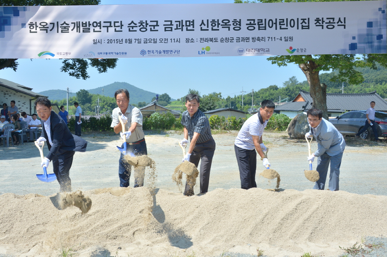- 순창군(군수 황숙주)과 국토교통과학기술진흥원(원장 김병수)는 7일 순창 방축마을에서 신한옥형 공립어린이집 착공식을 가졌다. 이날 김병수 원장 등 주민 100여명이 참석한 가운데 착공식을 가진 어린이집은 한옥기술개발 R&D 연구를 통해 개발된 다양한 기술을 적용하여 건립될 예정으로 총공사비 13억 3천만원(정부 출연금 8억원 포함)을 들여 연면적 457.5㎡ 부지에 건축면적 341.2㎡ 지하 1층, 지상 1층 규모로 12월 준공을 목표로 추진되게 된다. -2015. 8. 7-