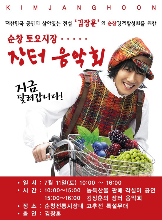 - 가수 김장훈이 함께 참여하는 ‘힘내라 순창경제 토요시장 장터음악회’가 오는 11일 순창전통시장 특설 무대에서 열린다. 이번 행사에서는 오전 10시부터 옥수수, 블루베리, 건표고버섯 등 질 좋은 농특산물을 저렴한 가격으로 살수있는 농특산물 판매장을 운영해 경제 활성화에 나선다. 또 각설이 공연과 다문화음식 체험 등을 진행해 관광객과 주민들의 흥을 돋울 예정이다. 김장훈 무료공연은 오후 3시부터 진행된다. -2015. 7. 8-