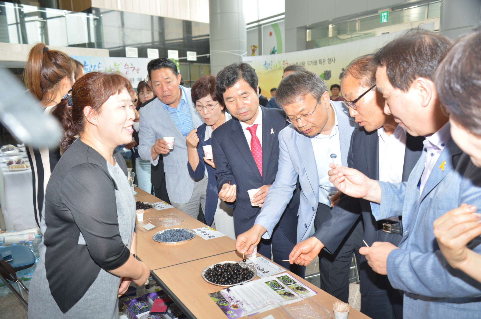 - 2일 전라북도교육청 본관 로비에서 ‘희망 나눔 순창 농특산물 직거래장’을 열어 복분자와 오디, 블루베리, 블랙커런트, 쌈채소 등 순창지역의 농특산물을 직원들에게 판매했다. 이날 김승환 도육감을 비롯 곽승기 부군수, 이기자 군의장, 최영일 도의원, 본청 국과장, 직속기관장, 지역교육장과 교직원들이 직판장을 찾아주었다. -2015. 7. 2-