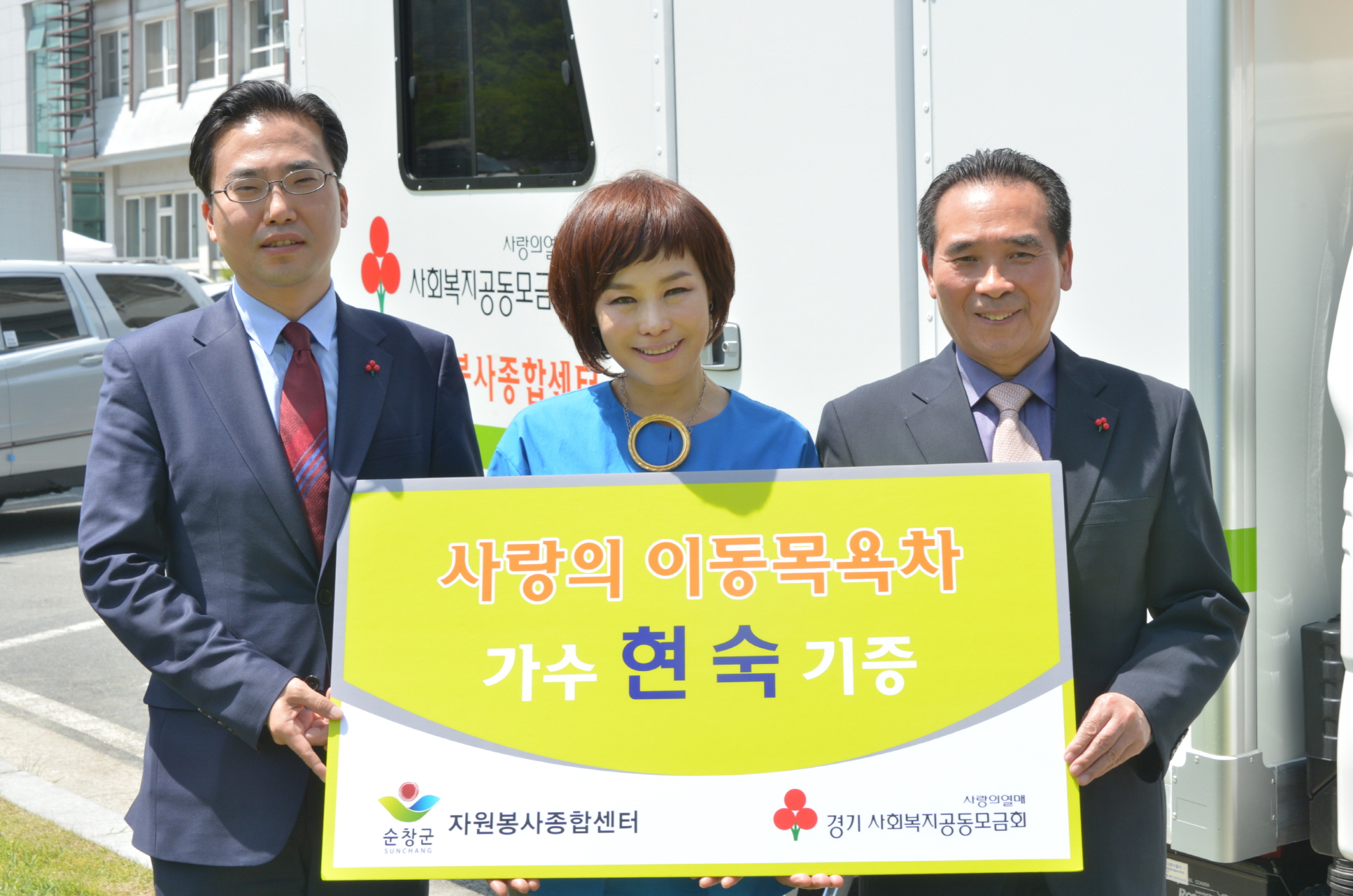 - 효녀가수로 유명한 현숙씨가 7일 순창군청 광장에서 가수 현숙씨와 황숙주 군수, 경기도 사랑의 공동모금회, 순창군 자원봉사센터 관계자 등 30여명이 참석한 가운데 이동방문 목욕차량 기증식을 가졌다. 현숙 씨는 당초 강원도나 경기도 자치단체에 이동방문 목욕차량을 기증하려 했으나 황숙주 순창군수가 중앙부처에 근무할 당시부터 특별한 인연과 지난해 순창군 홍보대사로 위촉을 계기로 순창군에 이동방문 목욕차량을 기증하게 됐다. -2015. 5. 7-