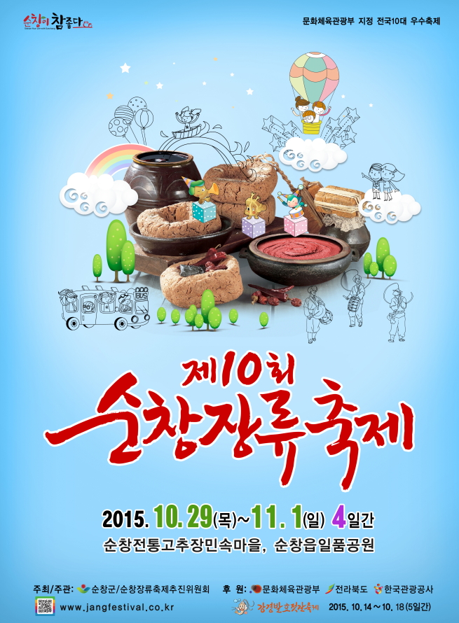 - 7일 군청 영상회의실에서 제3차 순창장류축제위원회를 개최하고 제10회 순창장류축제의 주제와 포스터, 신규프로그램을 선정 발표했다. 이날 축제주제로는 ‘자연의 맛 그대로, 순창의 맛 세계로’가 대상으로 선정됐으며 포스터는 고추장, 메주 등 전통장류식품이 풍성한 장독대 주변에 펼쳐지는 꿈의 향연을 상징화한 작품이 선정됐다. -2015. 5. 7-