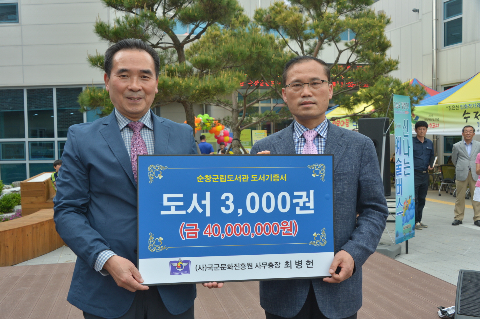 - 2일 순창군립도서관에서 열린 세계 책의 날 기념행사가 황숙주 군수를 비롯한 내외 귀빈과 400여명의 군민이 참석해 다양한 문화 행사로 군민들의 호평을 받으며 대성황을 이뤘다. 이날 최병헌 국군문화진흥원 사무총장이 순창군립도서관에 3천권의 도서를 기증하고 다 읽고 난 책 1권을 도서관에 기증하면 3권과 바꾸어주는 책 나눔 행사, 김은선 민화작가와 함께하는 민화그리기, 어린이를 위한 팝콘 만들기 등 다양한 체험마당 등 다양한 체험행사도 이어졌다. -2015. 5. 4-