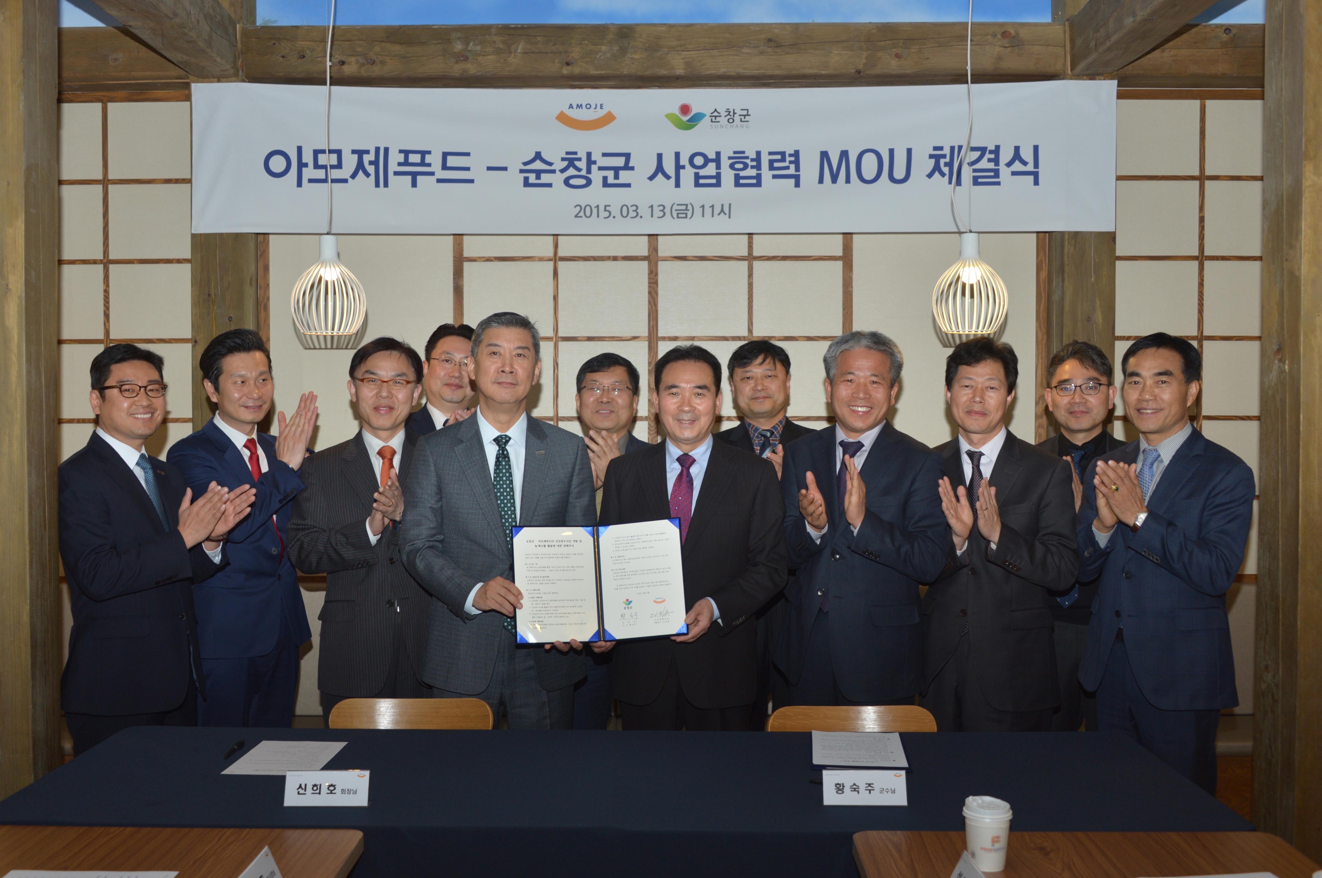 - 13일 서울 롯데월드몰 푸드캐피탈 왕궁매장에서 황숙주 군수와 아모제푸드(주) 신희호 회장, 관계자 등 40여명이 참석한 가운데 협약식을 가졌다. 이날 협약은 순창군에서 개발중인 건강장수밥상을 외식전문기업인 아모제푸드가 공항, 호텔 등에서 운영하는 프랜차이즈점에서 상품화하는 것을 주요 내용으로 하는 MOU를 체결했다. -2015. 03. 13-