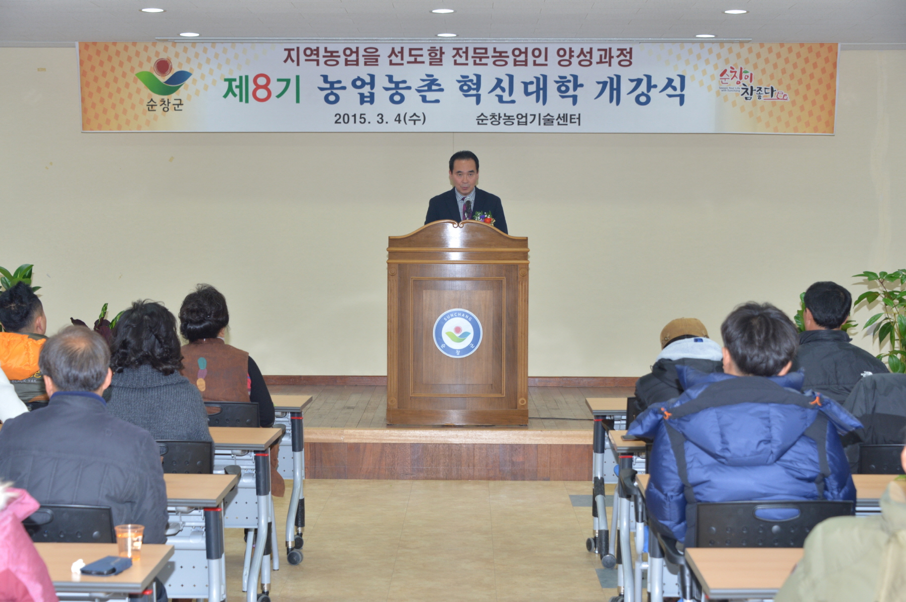 - 4일 농업기술센터 다목적 강당에서 황숙주 군수와, 이기자 군의회 의장, 교육생 50여명과 가족 등 100여명이 참석한 가운데 제8기 농업 농촌 혁신대학 개강식이 열렸다. 농업농촌혁신대학은 변화하는 농업환경에서 농가들에게 농업환경 교육은 물론 리더십, 마케팅, 관광전략, IT기술 등을 교육해 농촌지역의 경쟁력 강화를 목표로 운영중인 핵심인력양성 프로그램이다. -2015. 03. 04-