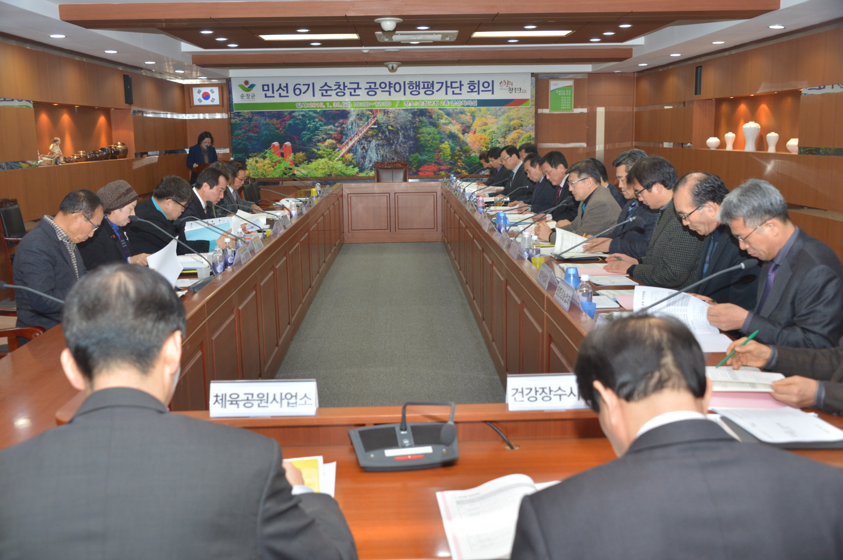 - 30일 군청 영상회의실에서 황숙주 군수, 김기곤 평가단장, 각 분야 전문가, 사업관련 부서장 등 20여명이 참석한 가운데 민선 6기 공약이행 평가단 회의를 가졌다. 이날 회의는 황숙주 군수와 김기곤 평가단장 등 각 분야 전문가로 구성된 10명의 공약이행 평가위원들이 참석했으며 사업관련 부서장들이 보고 후 질의 및 토론 순으로 진행됐다. 민선 6기 황숙주 군수가 약속한 공약은 테마형 관광산업의 명품순창을 위한 5개 사업, 군격을 향상시키는 교육·문화·