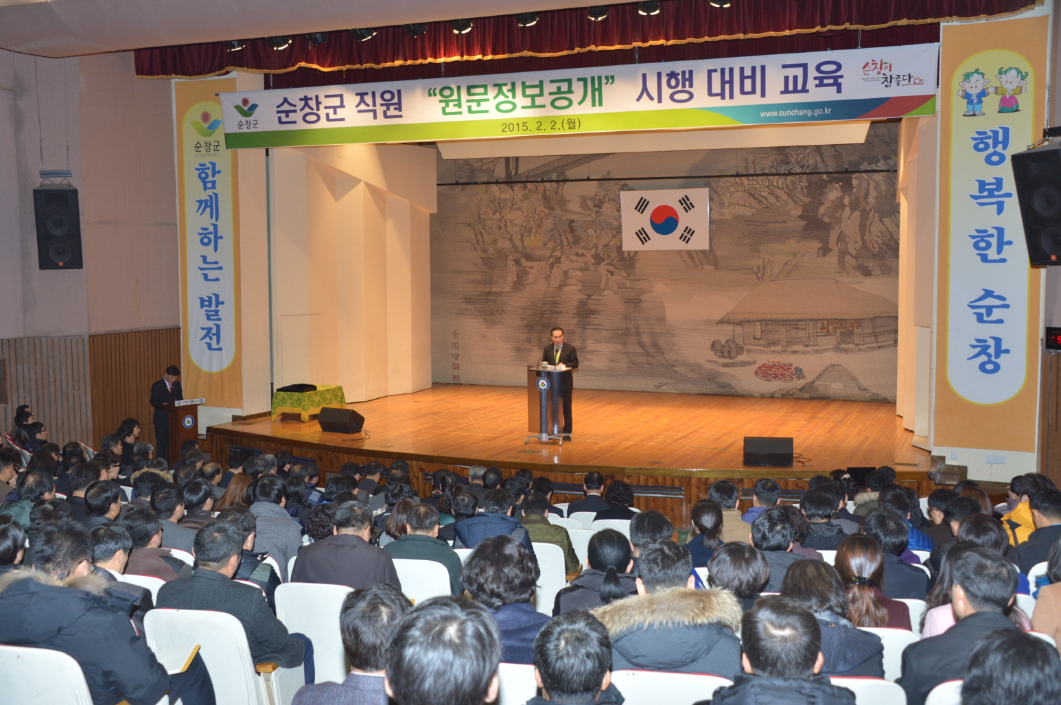 - 2일 향토관에서 열린 청원 월례조회를 통해 황숙주 군수는 “선공후사란 나보다는 공익을 우선시 하는 가치라며 공직자들이 먼저 개인의 이익보다는 순창지역을 위해 헌신하는 노력이 필요하다” 며 “공무원들이 순창에서 거주하며 지역 경제 활성화 등에 노력해 줄 것”을 주문했다. -2015. 02. 02 -