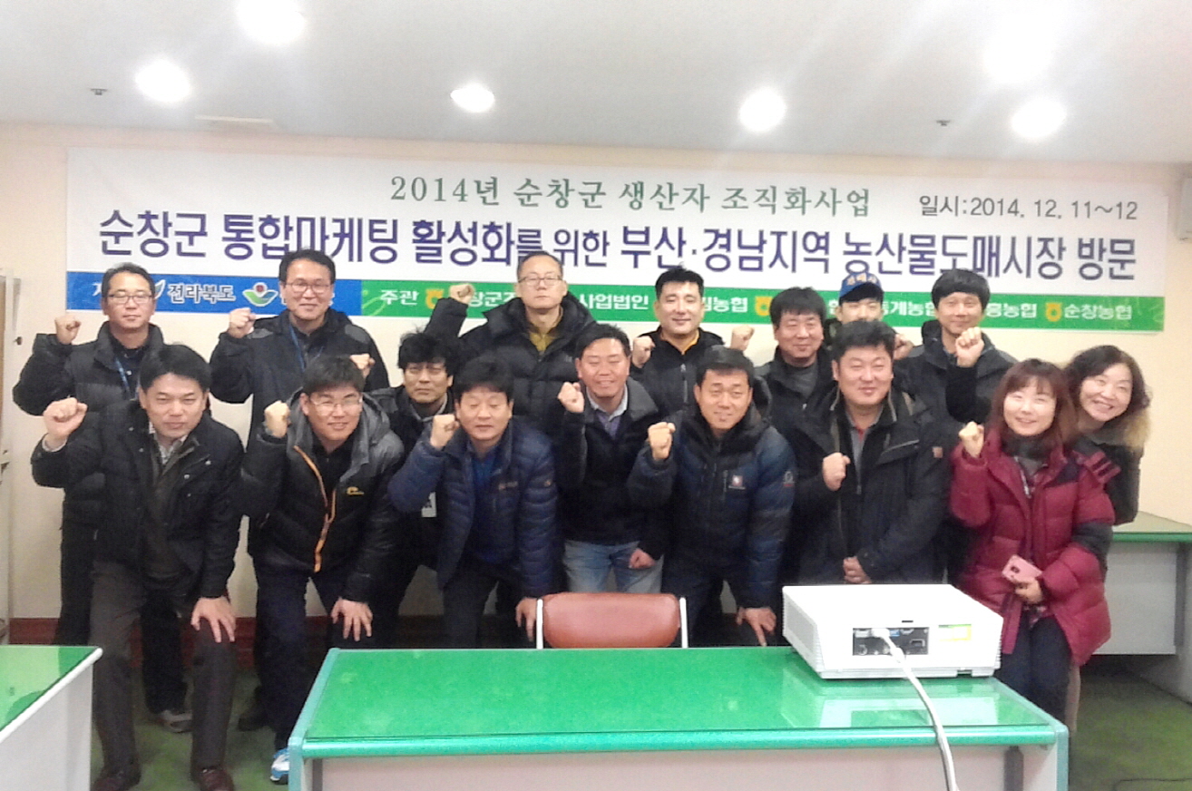 - 순창군이 5개 지역농협 공동출자로 출범한 조합공동사업법인과 함께 순창농산물 판로 확대를 위해 부산 경남지역 시장개척에 본격 나섰다. 부산과 경남 창원지역의 농산물 공판장을 방문해, 경매사와 공판장 관계자들을 만나 순창농산물의 우수성을 설명하고 출하에 대한 협의를 진행했다. -2014. 12. 16-