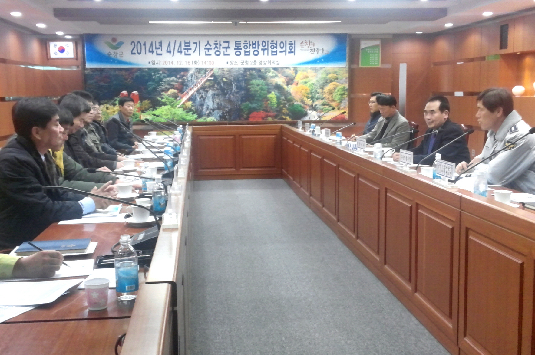 - 순창군은 최근 북한의 안보위협상황에 대비한 국가안보의식을 높이고 지역의 안전을 확보하기 위해 16일 4분기 통합방위협의회를 군청 영상회의실에서 개최했다. 이날 협의회에는 황숙주 군수를 비롯해 군부대, 경찰서, 교육지원청, 119안전센터 등 통합방위협의회 위원 16명이 참석해 기관.단체 간 통합방위 발전방안을 모색했다. -2014. 12. 16-