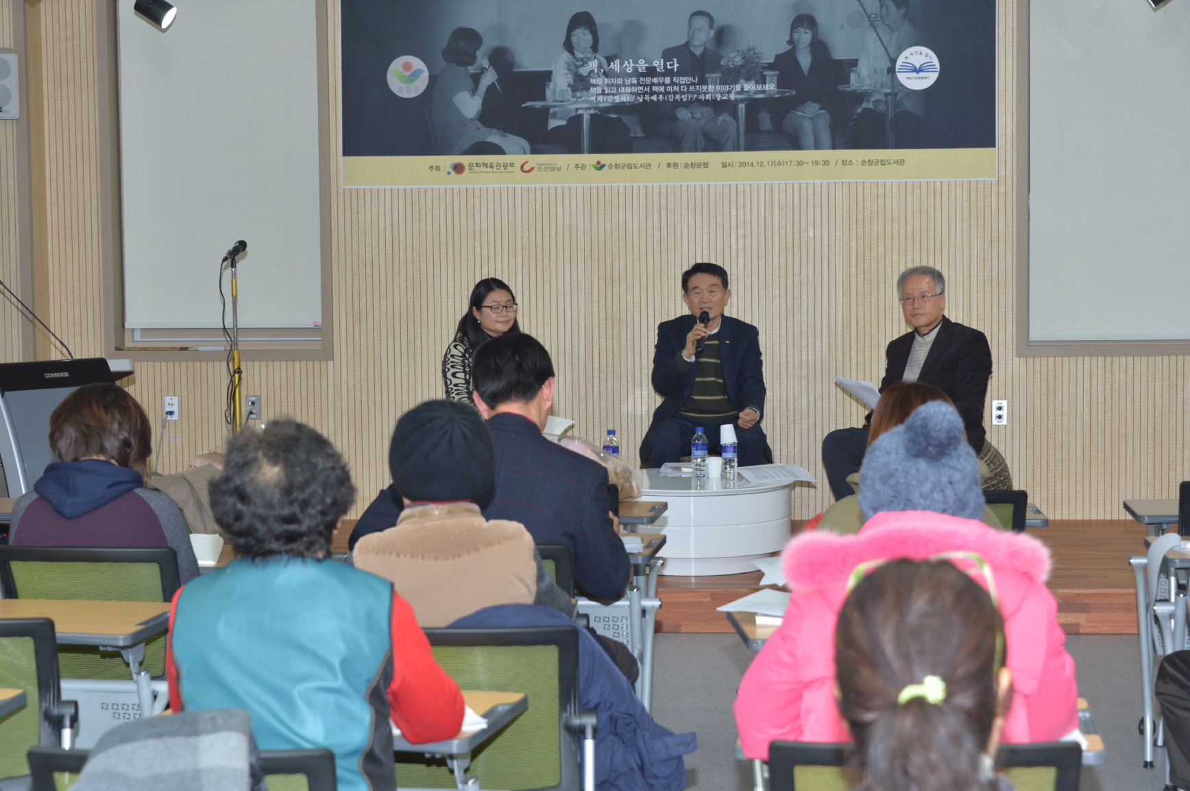 - 순창군립도서관은 17일 도서관 문화강좌실에서 인문정신문화 부흥과 책 읽는 문화 확산을 위해 김경희 작가와 김복임 낭독 배우를 초청하여 ‘책, 세상을 열다’ 저자는 “생각 날 때마다 글을 메모해 놓아라 그러면 눈물의 소금기가 보석이 될 것이다”, “좋은 책을 읽어라 그러면 인격의 눈금이 올라가고 따뜻한 가슴의 온도가 올라간다. 책을 읽는다는 것은 영혼을 충전하는 것이다”며 꾸준하게 책을 읽고 메모하는 습관을 강조했다. -2014. 12. 18-