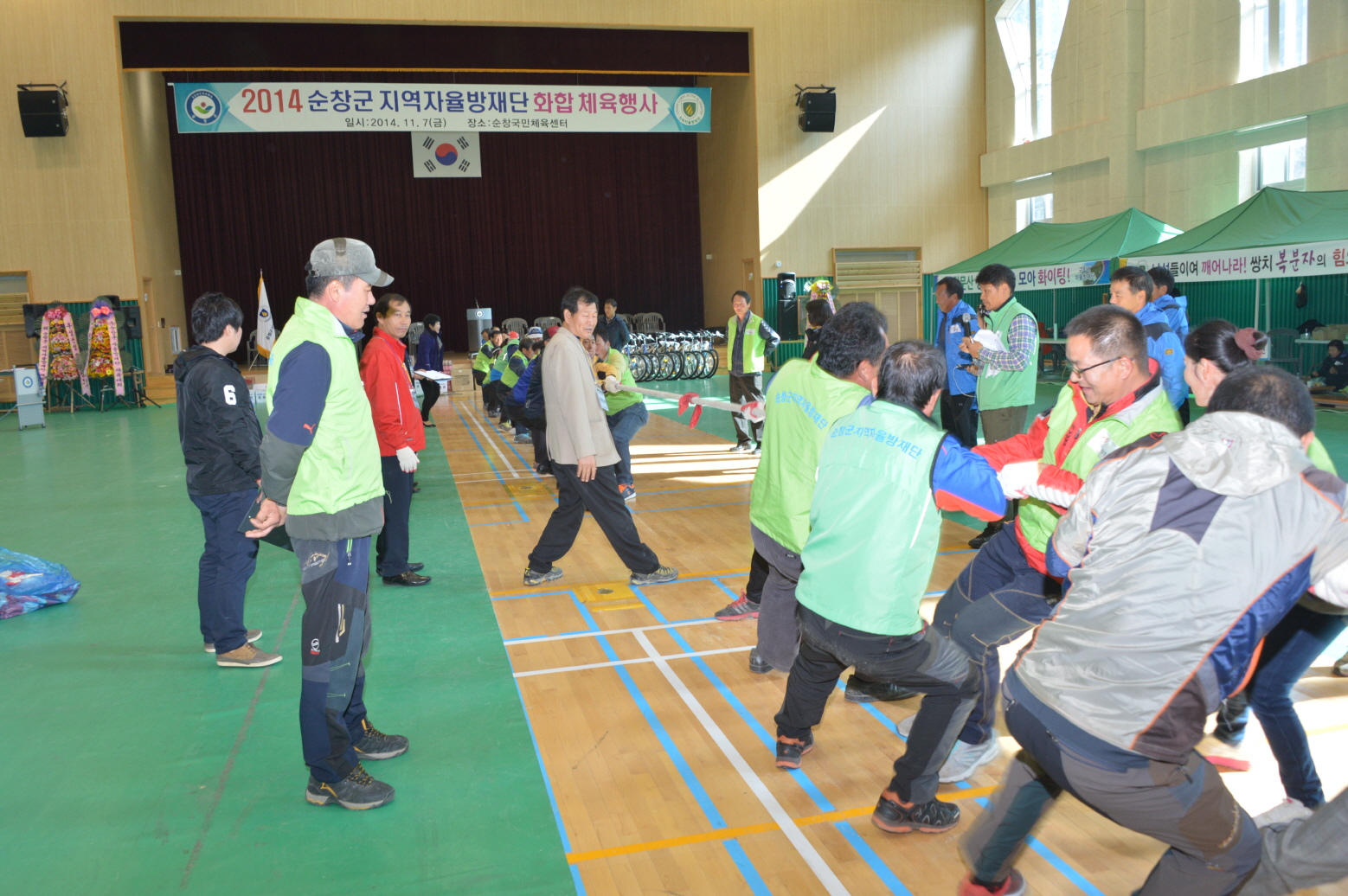 - 순창군이 재해 예방과 클린순창만들기 등 활동에 앞장서고 있는 지역자율방재단 체육행사 가 7일 순창국민체육센터에서 황숙주 군수, 이기자 의장 및 방재단원 등 400여명이 참석한 가운데 성황을 이뤘다. 이번 행사는 그동안 재해예방 및 클린순창 만들기에 어느 단체보다 앞장서고 있는 지역자율방재단의 사기 앙양을 위해 마련됐으며 윷놀이, 줄넘기, 줄다리기 등 다양한 체육행사가 펼쳐졌다. -2014. 11. 7-