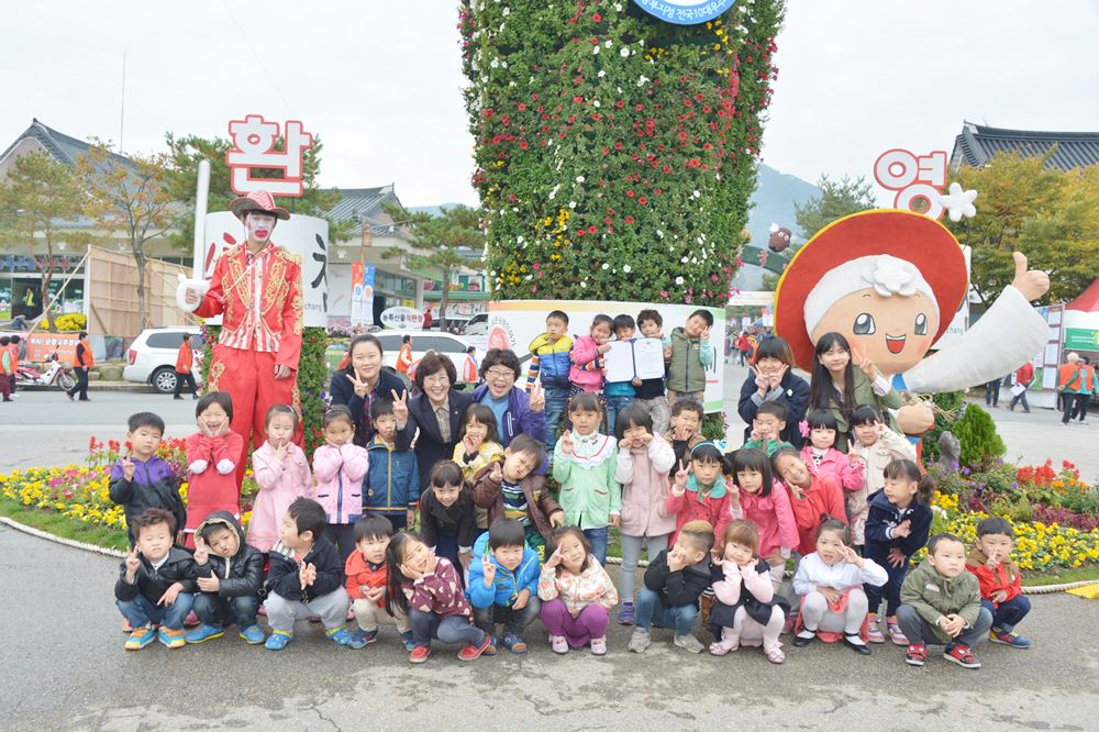 - 30일 제9회 순창장류축제가 한창인 순창전통고추장민속마을에 어린이들이 찾아 꽃탑앞에서 기념촬영을 하고 있다. 이번 장류축제는 30일부터 내달 2일까지 나흘간 자연이 빚은 순창이야기라는 주제로 10개 테마 80여개의 다채로운 프로그램이 순창전통고추장민속마을과 강천산일원에서 진행된다. -2014. 10. 30-