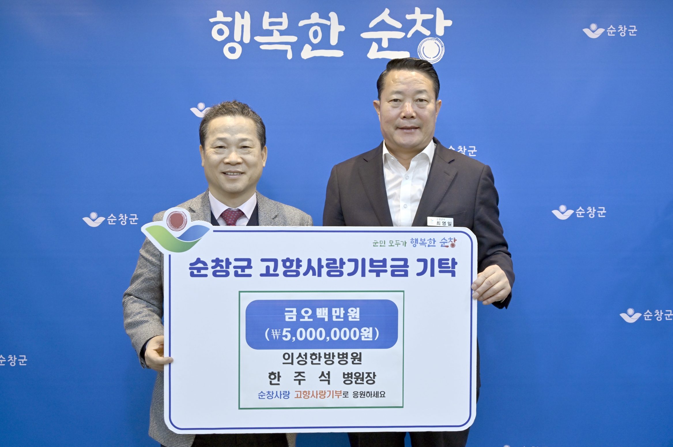 - 의성한방병원을 운영하는 한주석 병원장이 최근 순창군을 방문해 500만원의 고향사랑기부금을 전달했다.