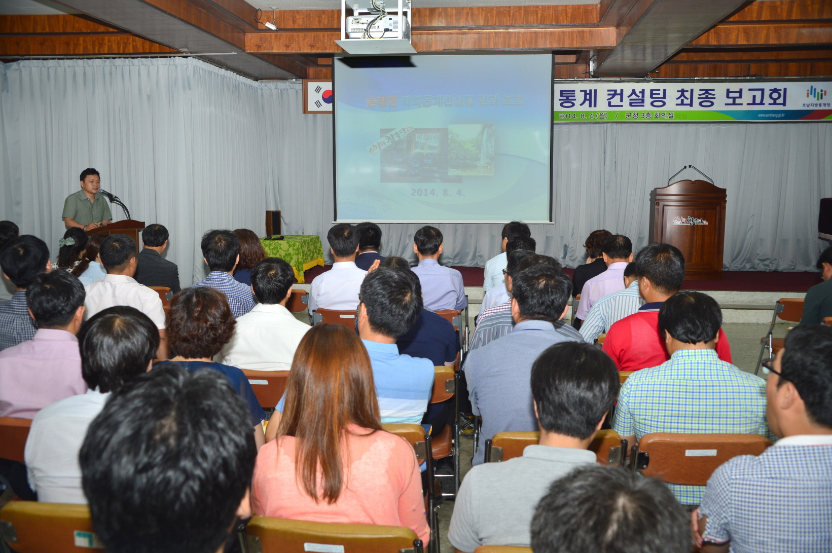 - 4일 군청 회의실에서 순창군청 공무원들과 호남지방통계청 전주사무소장 등 200여명이 참석한 가운데 ‘순창군 지역통계 컨설팅 최종 보고회’를 개최했다. 컨설팅은 지난 2월 14일 순창군과 호남지방통계청의 업무협약식(MOU)을 시작으로 착수설명회, 부서별 인터뷰, 설문조사, 자문단 회의를 거쳐 추진됐으며, 이창현 호남지방통계청 지역통계팀장이 컨설팅 결과를 보고했다. -2014. 8. 4-