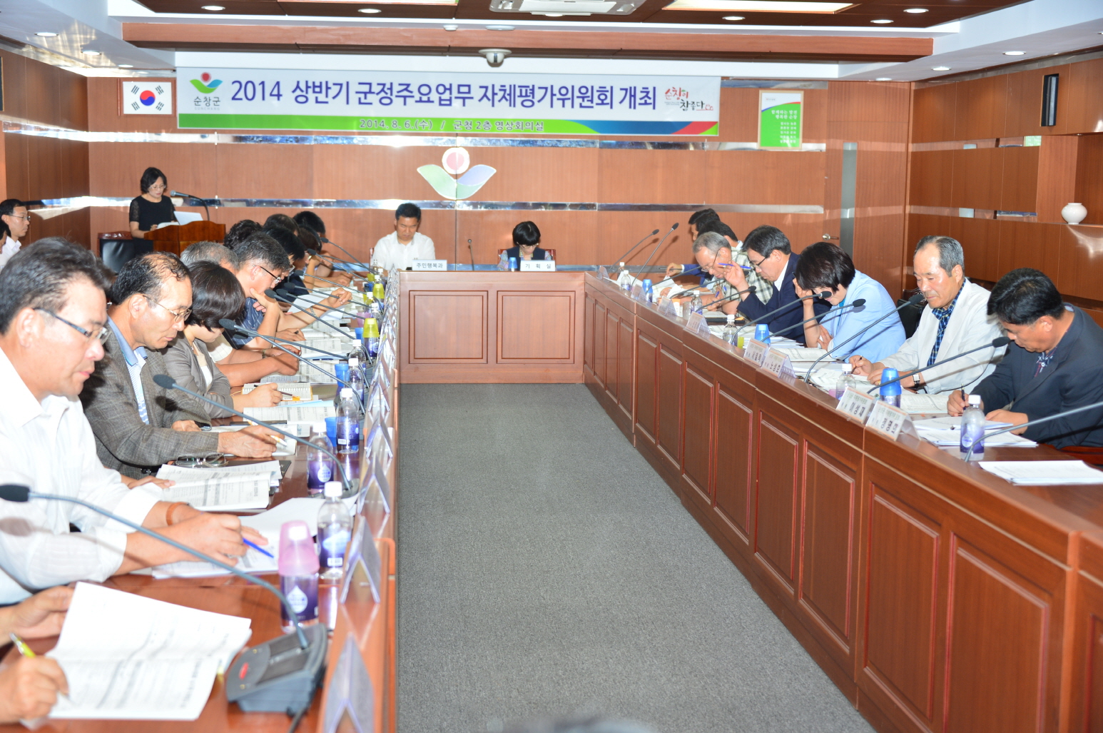 - 6일 군청 영상회의실에서 2014년도 상반기 군정주요업무 자체평가위원회를 개최했다. 평가위원회는 위원장인 이강오 부군수 주재로 내부위원 3명, 외부위원 6명의 평가위원과 부서장 20여명 등이 참석한 가운데 일반행정, 지역경제.개발, 문화.환경사업, 보건.사회복지분야 등 총 52개사업으로, 그 중 37개사업이 이미 완료됐거나 50% 이상의 정상추진율을 보였다. -2014. 8. 6-