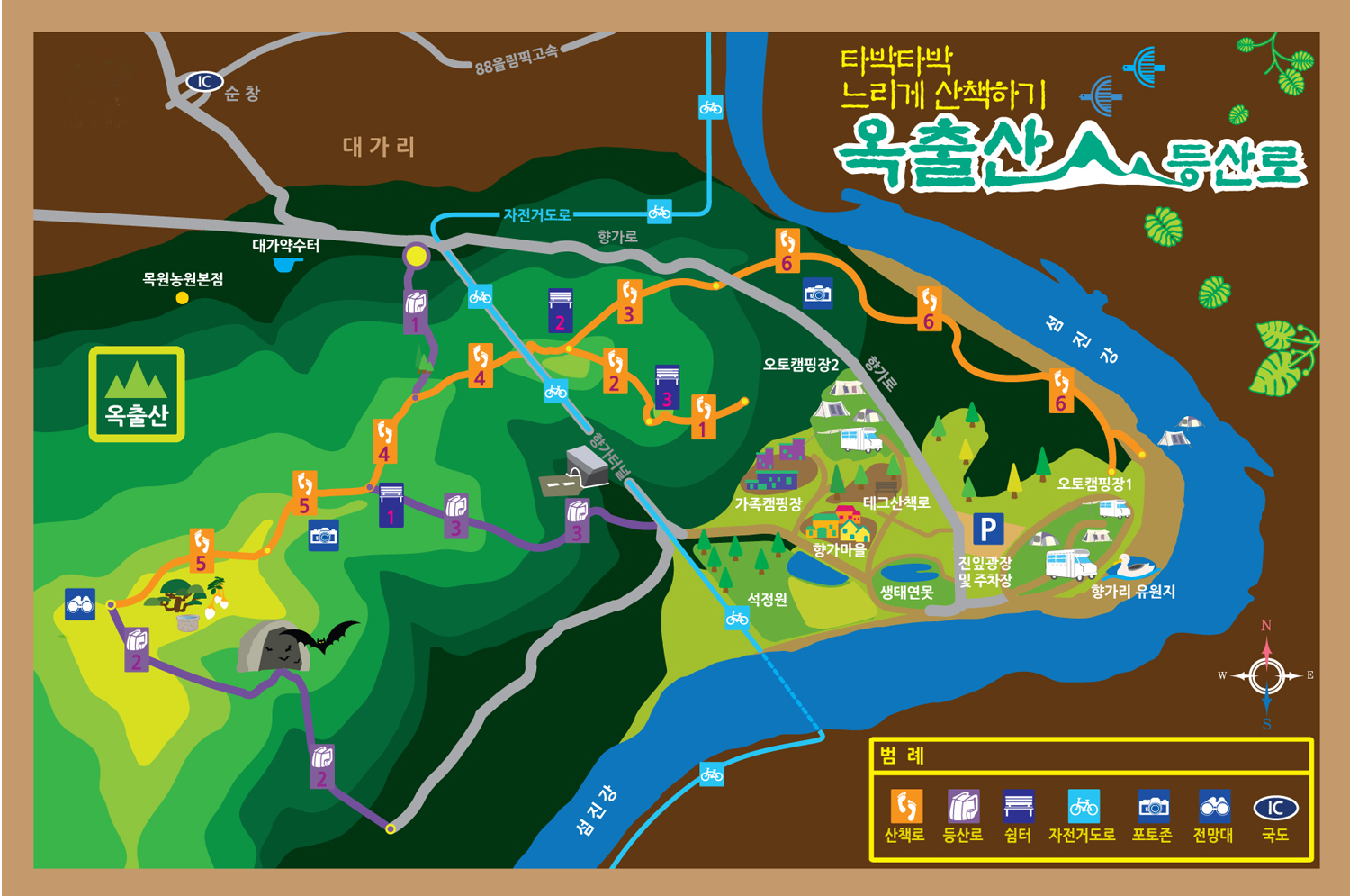 - 순창군이 섬진강을 제2의 관광명소로 만들기 위한 개발에 속도를 내고 있다. 군이 155억을 투입해 추진하고 있는 섬진강향가관광개발사업이 순조롭게 추진되고 있다. 섬진강향가관광개발사업은 옥출산 전망대와 산책로, 쉼터 등이 조성되는 숲속체험지구조성사업과 캠핑객이 야영할 수 있는 캠팽장, 캐라반, 방갈로 및 부대시설을 갖출 건강휴양체험지구 조성사업으로 나누어 추진되고 있다. -2014. 07. 17-