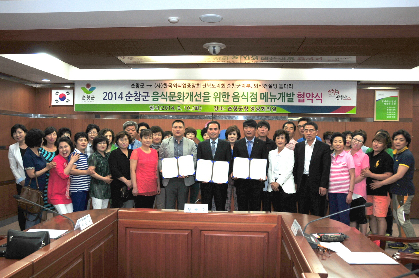 - 10일 군 영상회의실에서 (사)한국외식업중앙회 순창군지부(지부장 이상봉), 외식컨설팅 ‘돌다리’(대표 이북주) 등 3개 기관이 참여한 가운데 음식문화 발전을 위한 협약식을 가졌다. 에서는 일반음식점 음식문화개선을 위한 행.재정적 지원을 담당하고, (사)한국외식업중앙회 순창군지부는 순창군의 음식문화 개선과 고객 맞춤형 식단 개발을 위해 최선의 노력을 다하기로 했다. -2014. 6. 11-