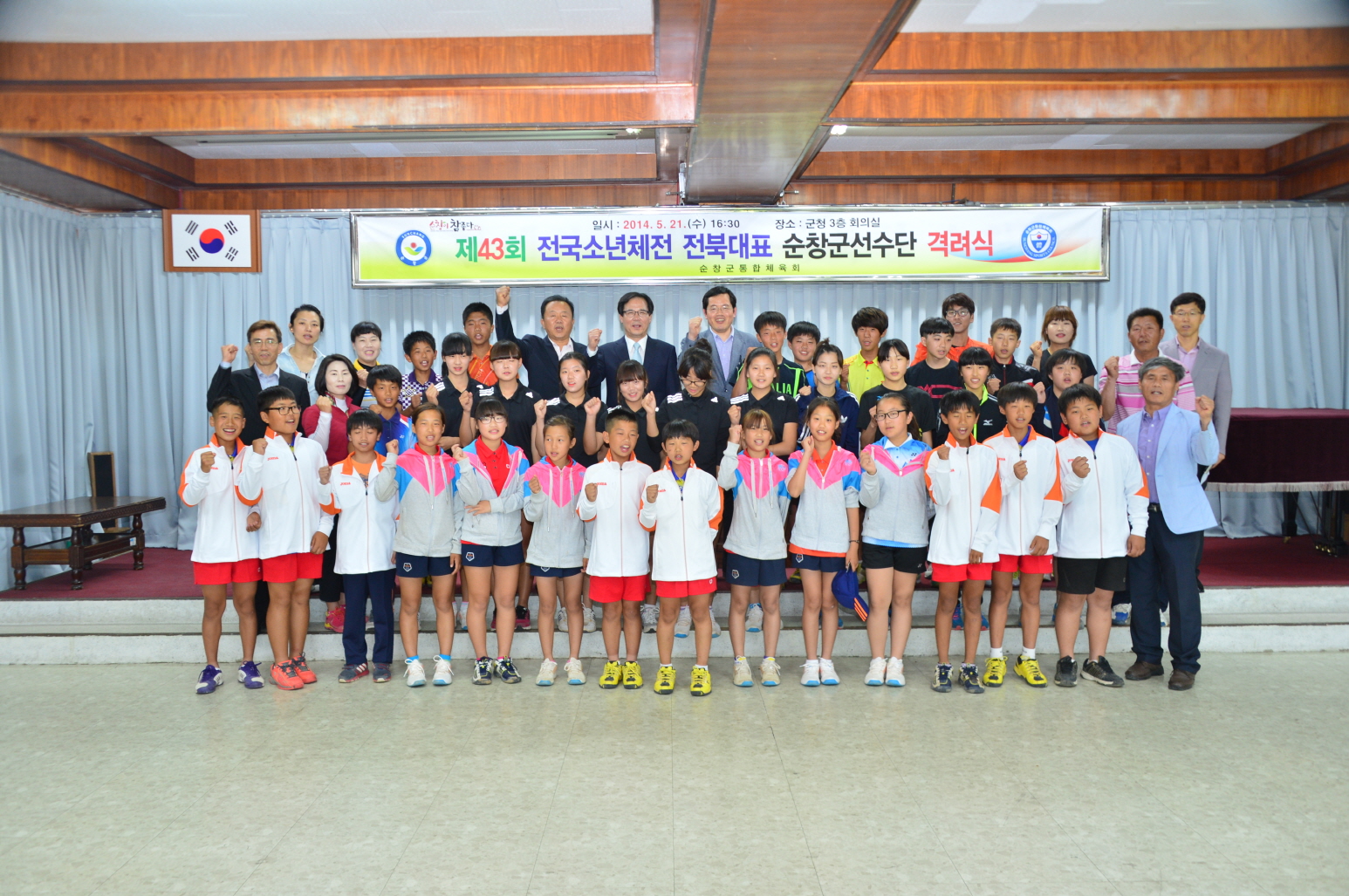 - 21일 군청 회의실에서 제43회 전국소년체육대회 전북대표로 출전하는 순창군 선수단을 초청하여 노고를 격려하고 파이팅의 시간을 가졌다. 이날 격려식에는 이강오 순창군수 권한대행을 비롯해 순창군통합체육회 한동락 수석부회장 등 선수단과 감독, 코치 등 50여명이 참석했다. 전북대표 순창군 선수단은 정구 28명, 육상 6명, 역도 1명 등 3개종목 35명의 선수가 출전한다. -2014. 5. 21-