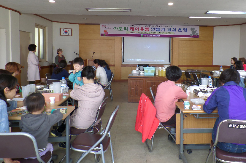 - 순창군보건의료원은 아토피피부염 환아 보호자 30명을 대상으로 천연재료를 이용한 아토피케어용품 만들기 교실을 운영하고 있다. 지난달 24일부터 이달 15일까지 매주 목요일 4회에 걸쳐 순창군보건의료원 3층 회의실에서 진행되고 있는 이번 프로그램을 통해 아토피질환의 검증되고 신뢰성 있는 정보전달을 위해 지역사회네트워크 전문가를 통한 올바른 지식전달에 주력하고 있다. -2014. 5. 7-