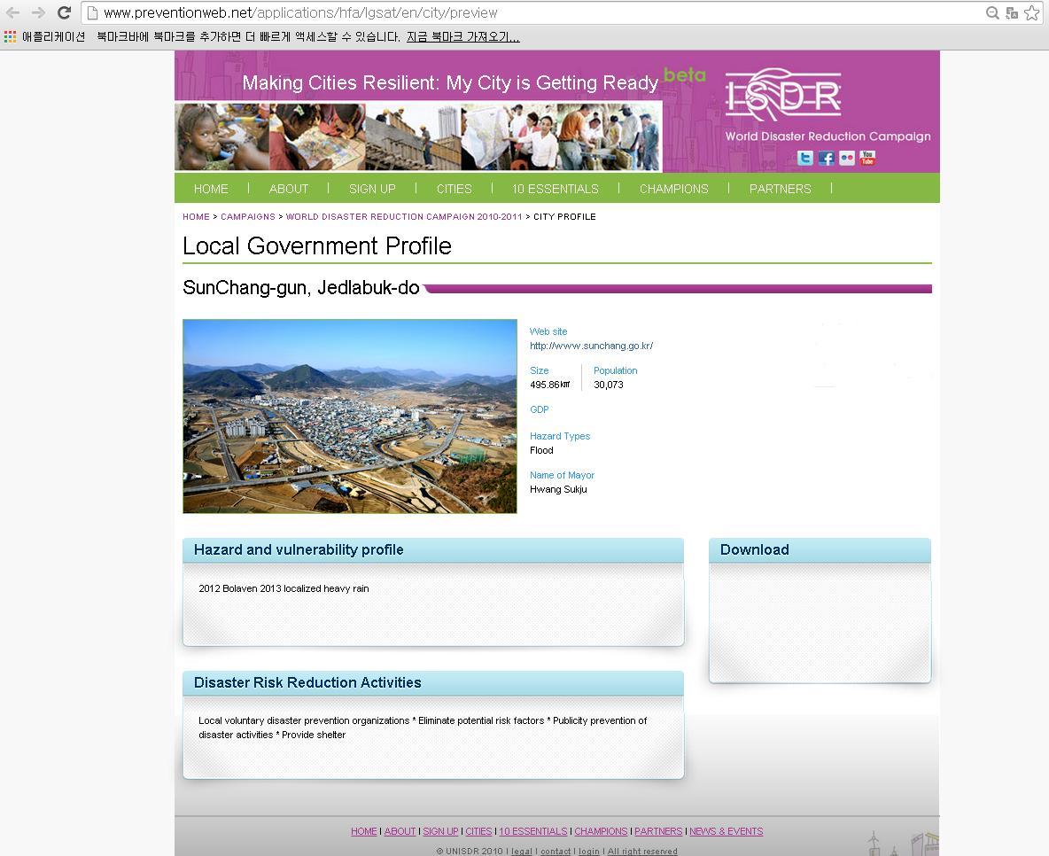 - 순창군이 UN ISDR(국제연합 재해경감전략사무국)에서 주관하는 ‘기후변화 및 재해에 강한 도시 만들기 캠페인'에 지난달 30일부로 가입이 완료됐다. UN ISDR은 지구온난화 등 세계적인 기후변화로 인한 대규모 재해 빈발에 따라 국제협력과 공동대응을 위해 UN 사무국 내 설립한 기구다. UN ISDR은 지난 2010년부터 전 세계 지방자치단체 대상으로 ‘기후변화 및 재해에 강한 도시만들기 캠페인’을 전개하고 있다. -2014. 5. 9-