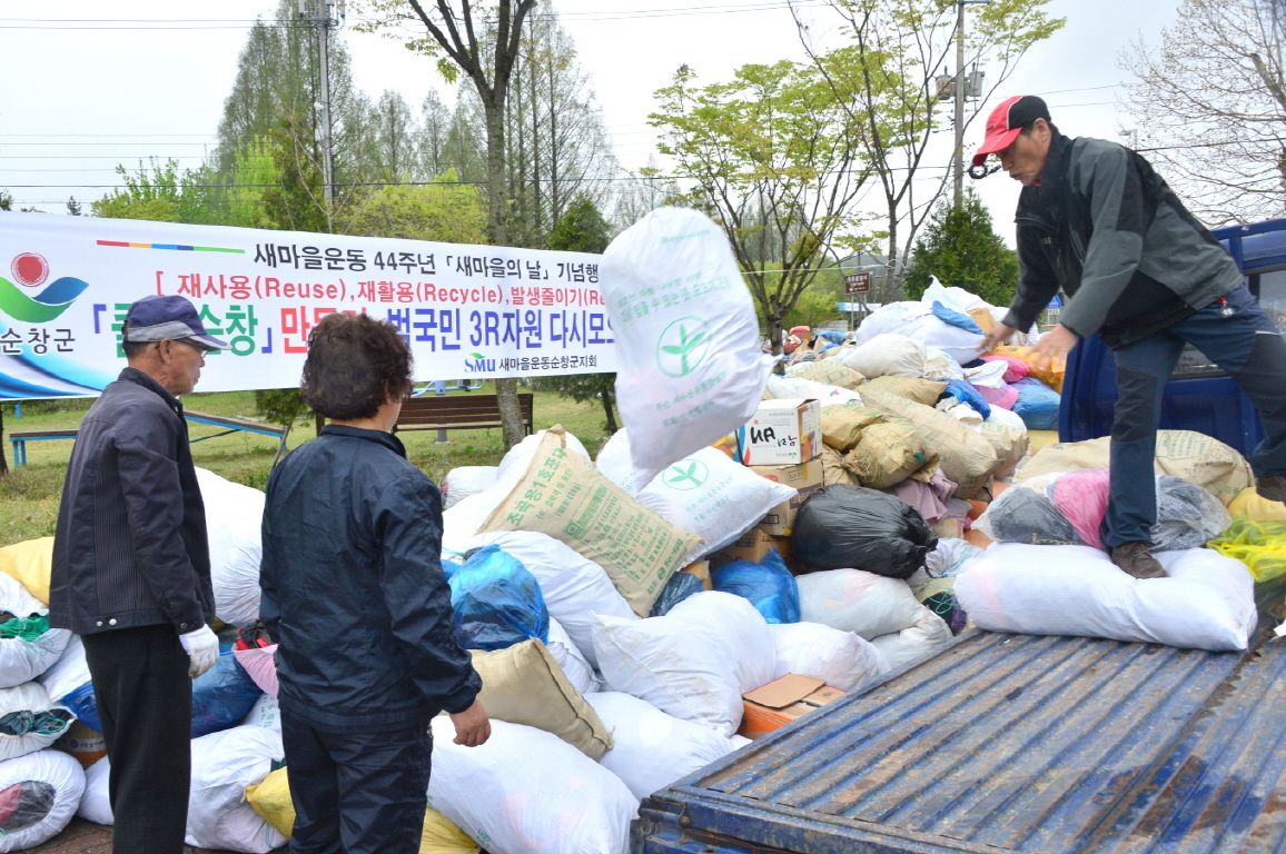 - 새마을운동 순창군지회(회장 권오준)는 18일 순창군새마을회관 앞 광장에서 새마을운동 44주년 새마을의 날 기념행사와 클린.그린 순창만들기운동 사업의 일환으로 3R「재사용(Reuse), 재활용(Recycle), 발생줄이기(Reduce)」재활용품 모으기 경진대회를 실시했다. 이날 행사는 11개읍면 회장단 및 지도자 100여명이 참여한 가운데 헌옷, 가방, 신발, 인형 및 플라스틱 등 각종 재활용품 15톤을 수집해 환경보전과 경제 살리기 운동을 실천했다. -2014. 4. 19-