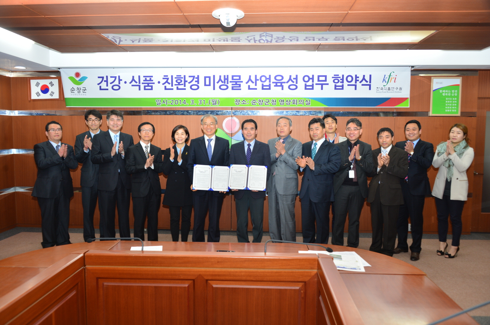 - 순창군은 31일 군청 2층 영상회의실에서 한국식품연구원과 건강.식품.친환경 발효미생물 산업 육성을 위한 협약식을 가졌다. 이날 협약식은 한국식품연구원 권대영 원장과 황숙주 순창군수 등 15명의 기관 관계자가 참석했다. -2014. 3. 31-