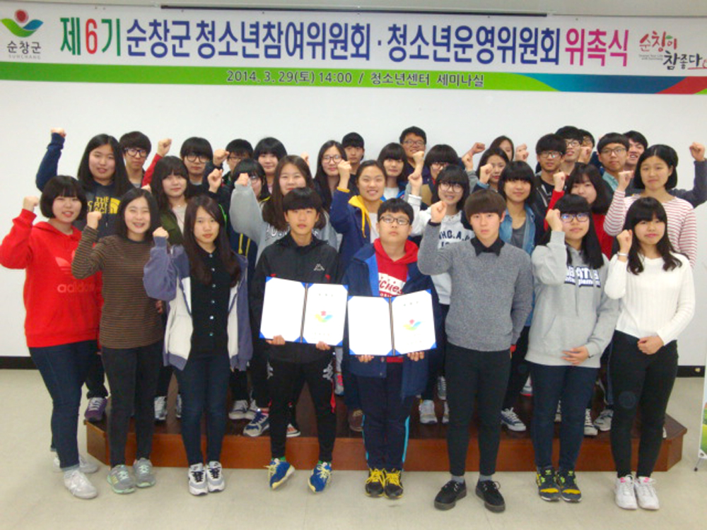 - 제6기 청소년참여위원회.청소년운영위원회가 이달부터 다양한 활동을 펼친다. 29일 청소년센터에서 순창군 관계자와 청소년 등 30여명이 참석한 가운데 위촉식을 가졌다. 청소년 참여위원회.청소년운영위원회는 순창군 청소년관련 정책과 사업에 관한 의견제시, 자문.평가, 순창군청소년센터 기능 유지를 위한 모니터링 및 프로그램에 대한 자문 활동 등 다양한 활동을 하게 된다. -2014. 3. 31-