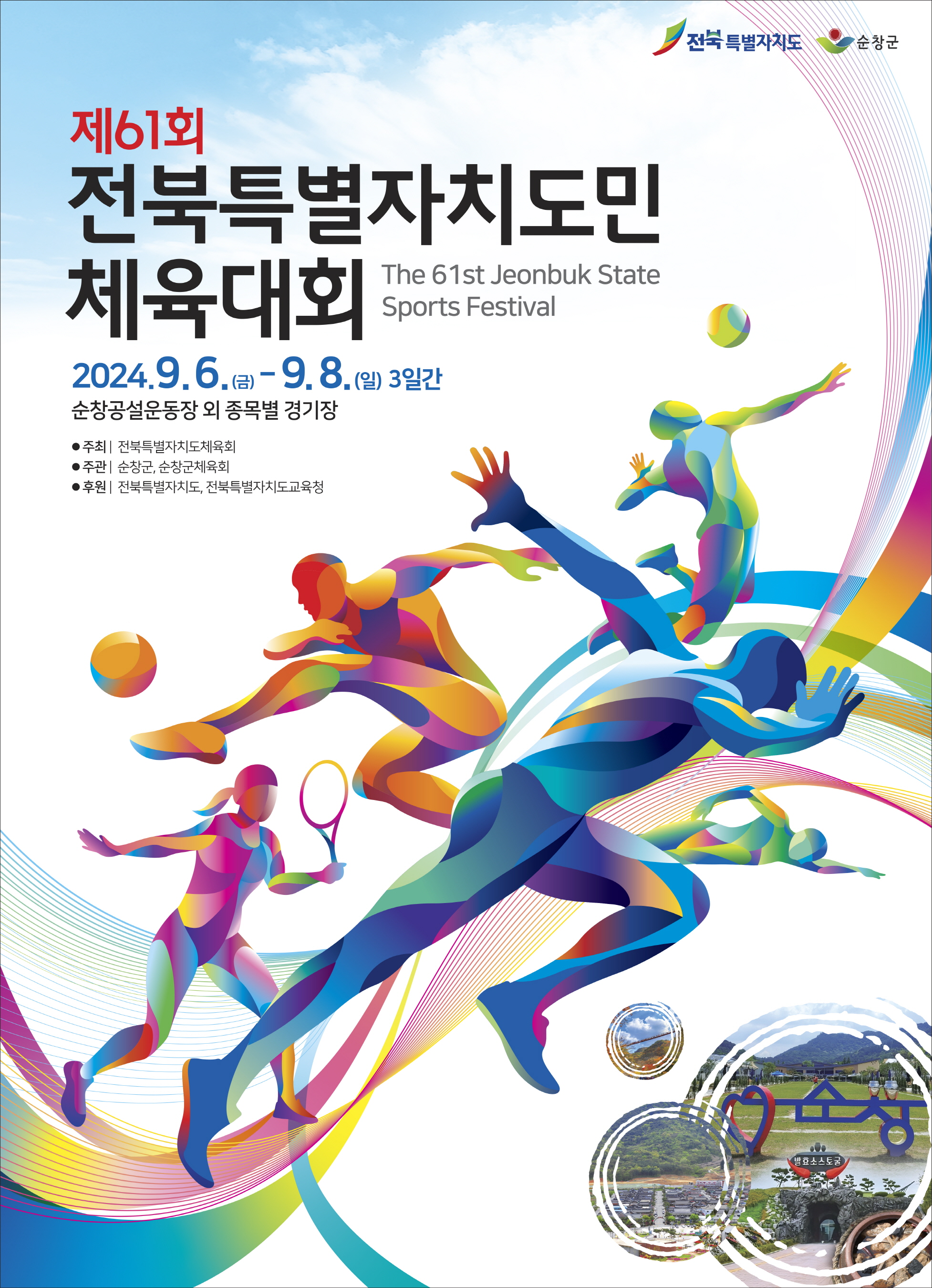 - 180만 도민이 스포츠로 하나 되는‘제61회 전북특별자치도민체육대회’가 오는 6일 오후 7시 순창공설운동장에서 막을 올린다. 이번 대회는 전북특별자치도 출범 이후 열리는 첫 체전으로‘행복담는 순창에서, 함께 여는 특별자치도’라는 슬로건으로 9월 6일부터 9월 8일까지 14개 시군 체육인과 임원 1만여명, 방문객 1만 5천여명 등 2만 5천여명이 함께 화합의 무대를 선보일 예정이다. -2024년 9월 3일-