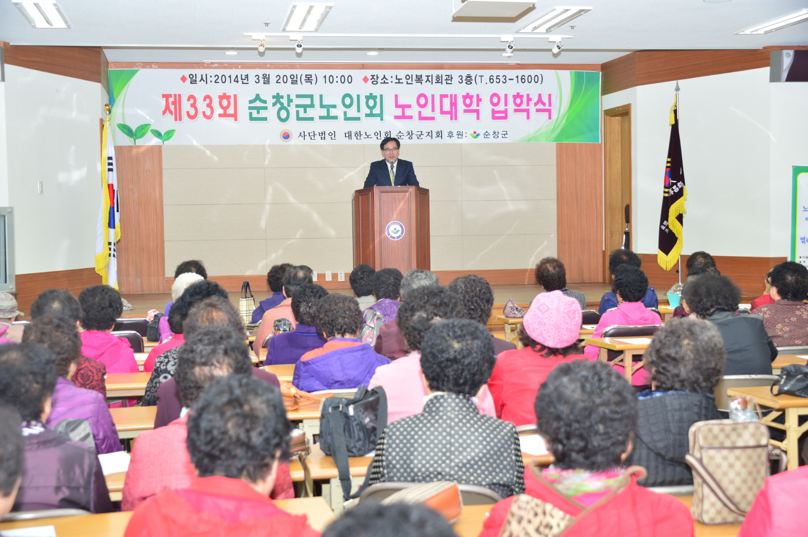 - 대한노인회 순창군지회(지회장 김영배)가 주관한 제 33회 순창군 노인대학(학장 김명수) 입학식이 20일 노인복지회관 3층에서 이강오 순창군부군수, 최영일 의장, 오은미 도의원을 비롯해 읍면노인회원과 110명의 노인대학생이 참석한 가운데 입학식이 열렸다. 순창군 노인대학은 10월말까지 매주 목요일 10시부터 2시간씩 운영하며 유명강사징과 대학교수, 기관사회단체장들의 강의와 현장학습으로 운영한다. -2014. 3. 20-