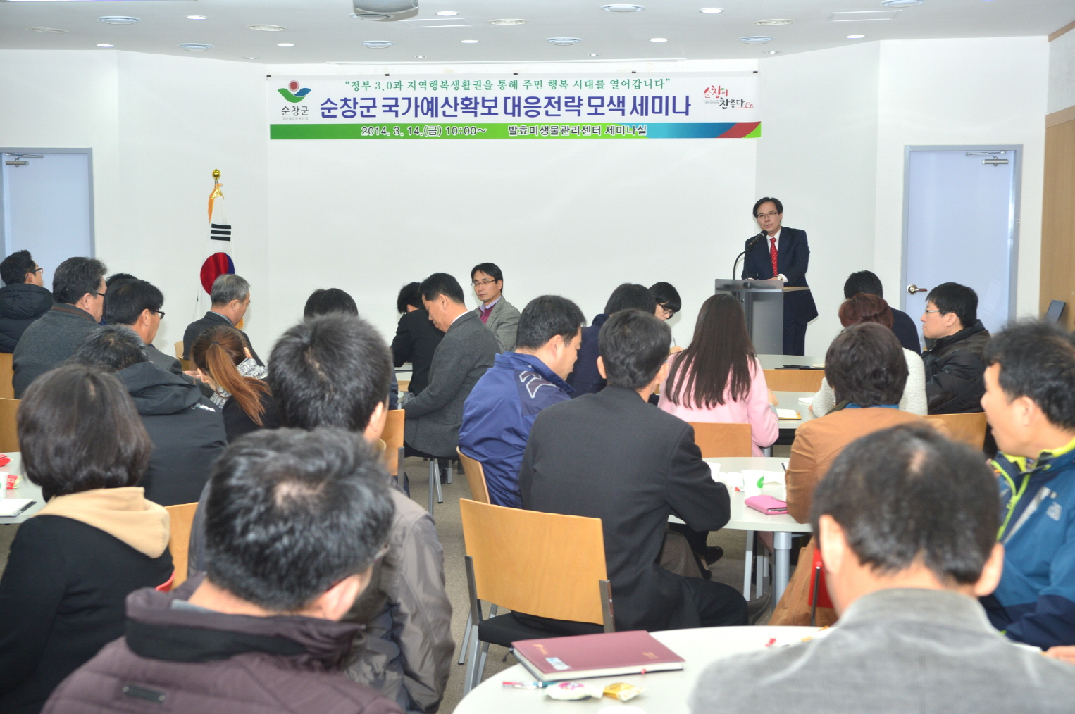 - 순창군의 전략적인 신성장 동력사업 발굴을 위해 순창장류특구 내 발효미생물관리센터 세미나실에서 60여명이 참석한 가운데 이강오 부군수 주재로‘국가예산확보 대응전략 마련 세미나를 가졌다. 이날‘정부 정책의 부합성’과 ‘순창군의 추진 당위성’, ‘시기의 적합성’을 사업발굴과 예산확보의 중요한 세 가지 키워드로 제시했다. -2014. 3. 18-